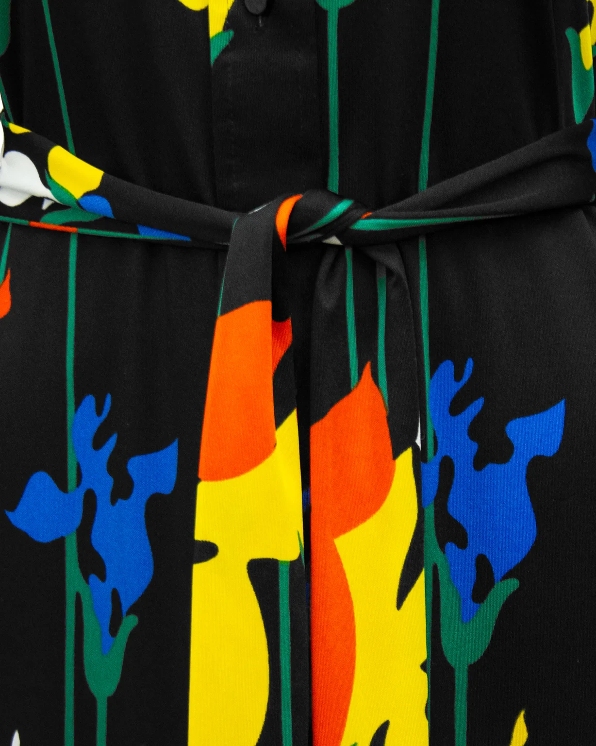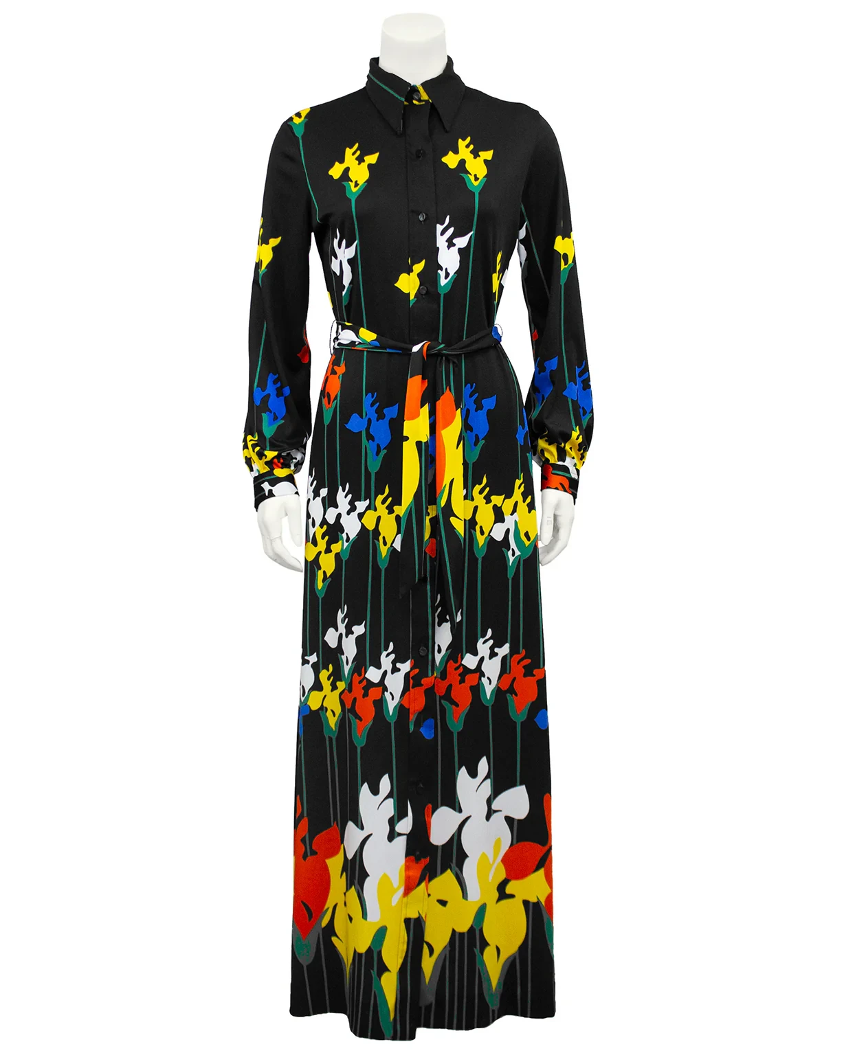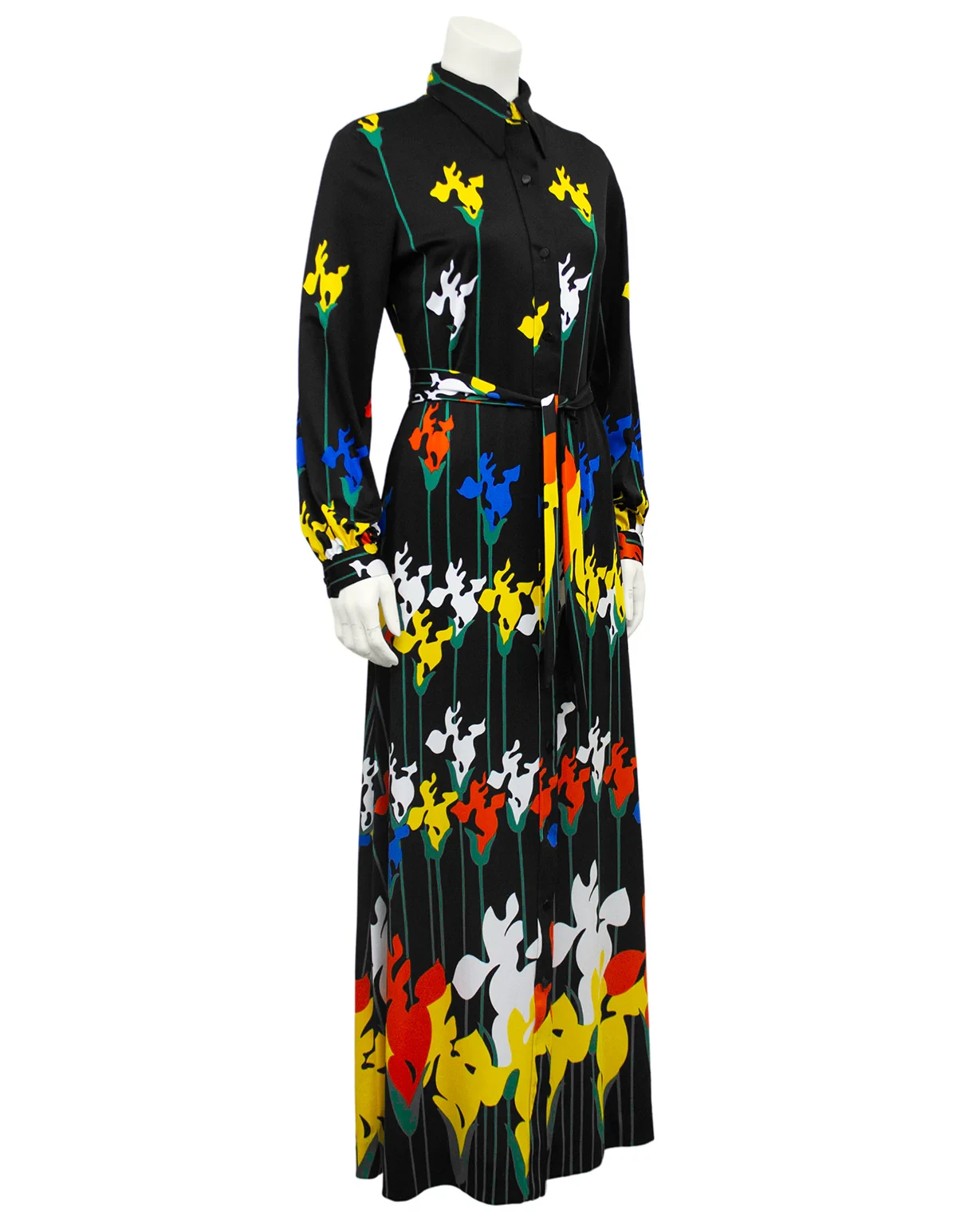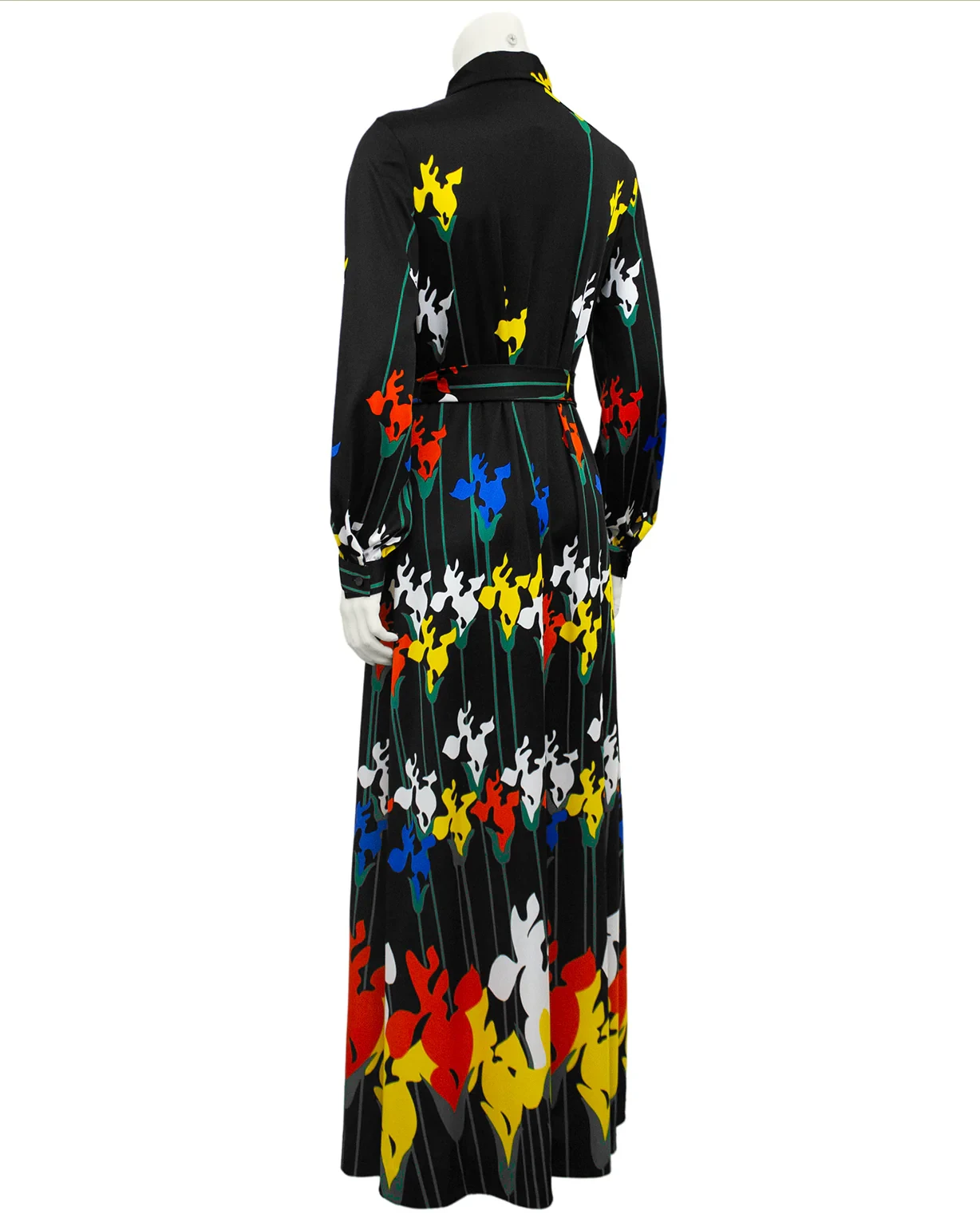 Платье макси из полиэстера Lanvin 1970-х годов с яркими цветами ириса. Цветы постепенно увеличиваются к низу. Платье-рубашка с воротником и пуговицами, дополнительный пояс в тон можно завязать на талии.