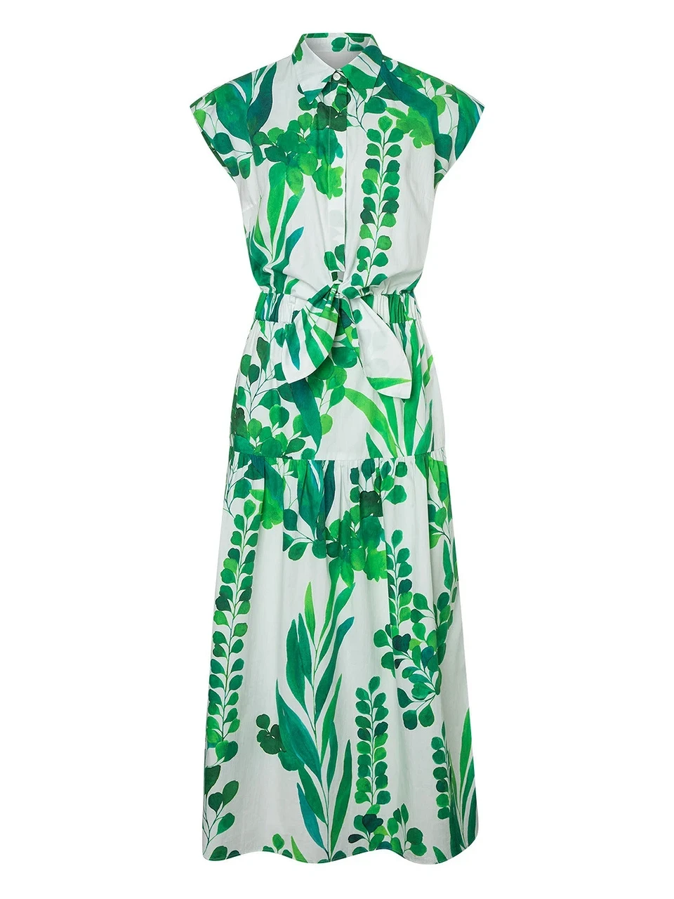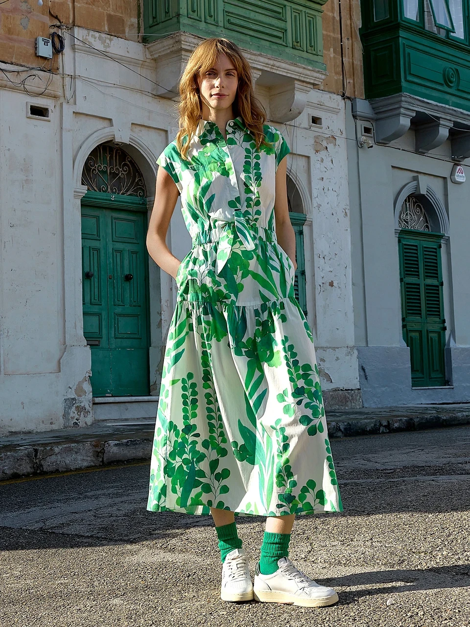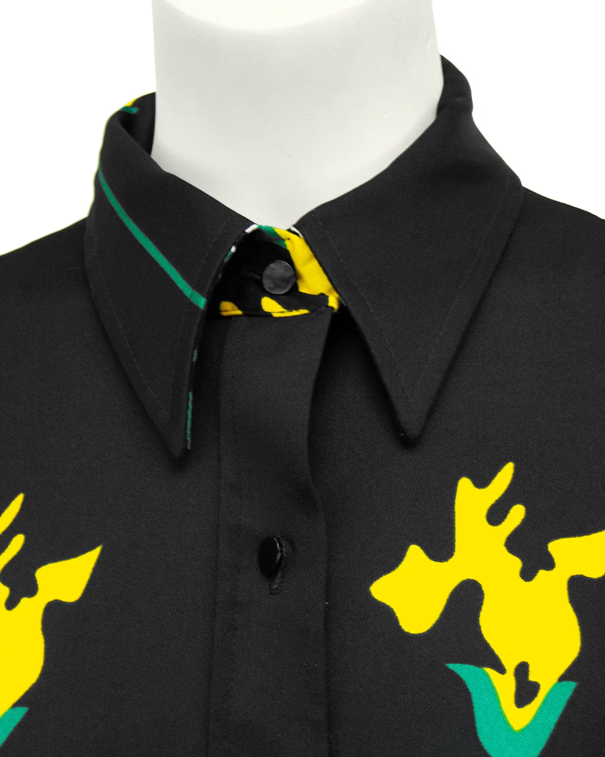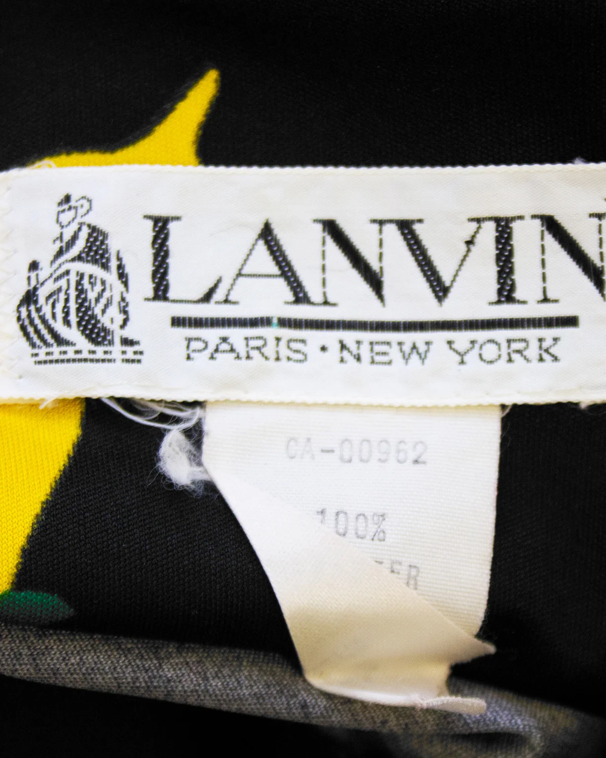 Платье макси из полиэстера Lanvin 1970-х годов с яркими цветами ириса. Цветы постепенно увеличиваются к низу. Платье-рубашка с воротником и пуговицами, дополнительный пояс в тон можно завязать на талии.