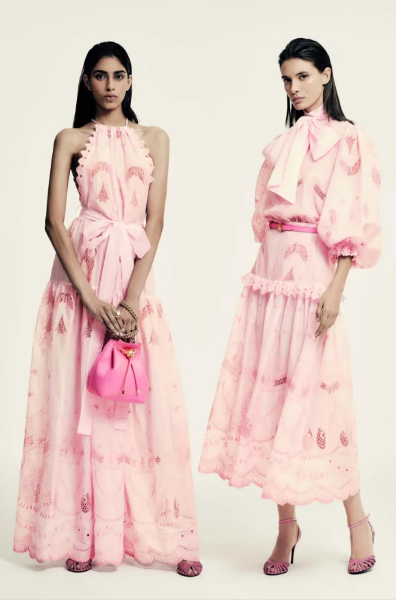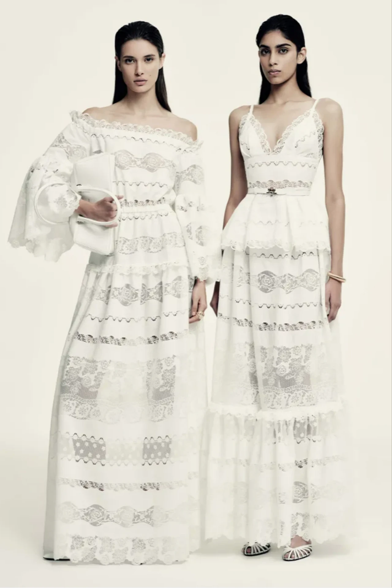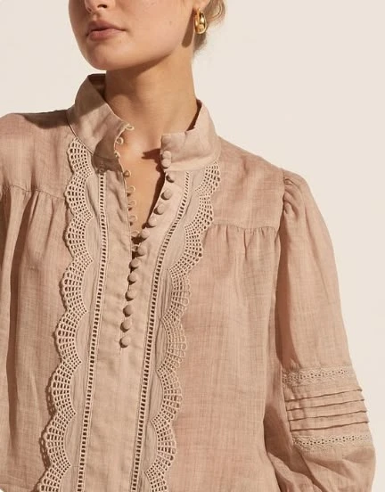 Джинсовая блузка от Zimmermann из круизной коллекции нынешнего года обладает узнаваемым традиционным фасоном марки. Это пышные длинные рукава с эластичными кулисками и воротник-стойка. Оригинальная делать, которая придает модели романтический шарм, — вставки из деликатной хлопковой кружевной тесьмы разной ширины. Еще один необычный шаг — использование нежных цветочных вязаных пуговиц.