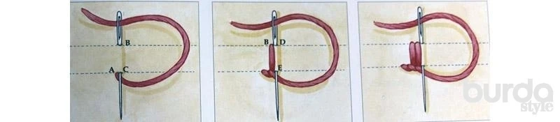 Выведите иглу в точке Е, укладывая нитку под кончиком иголки.