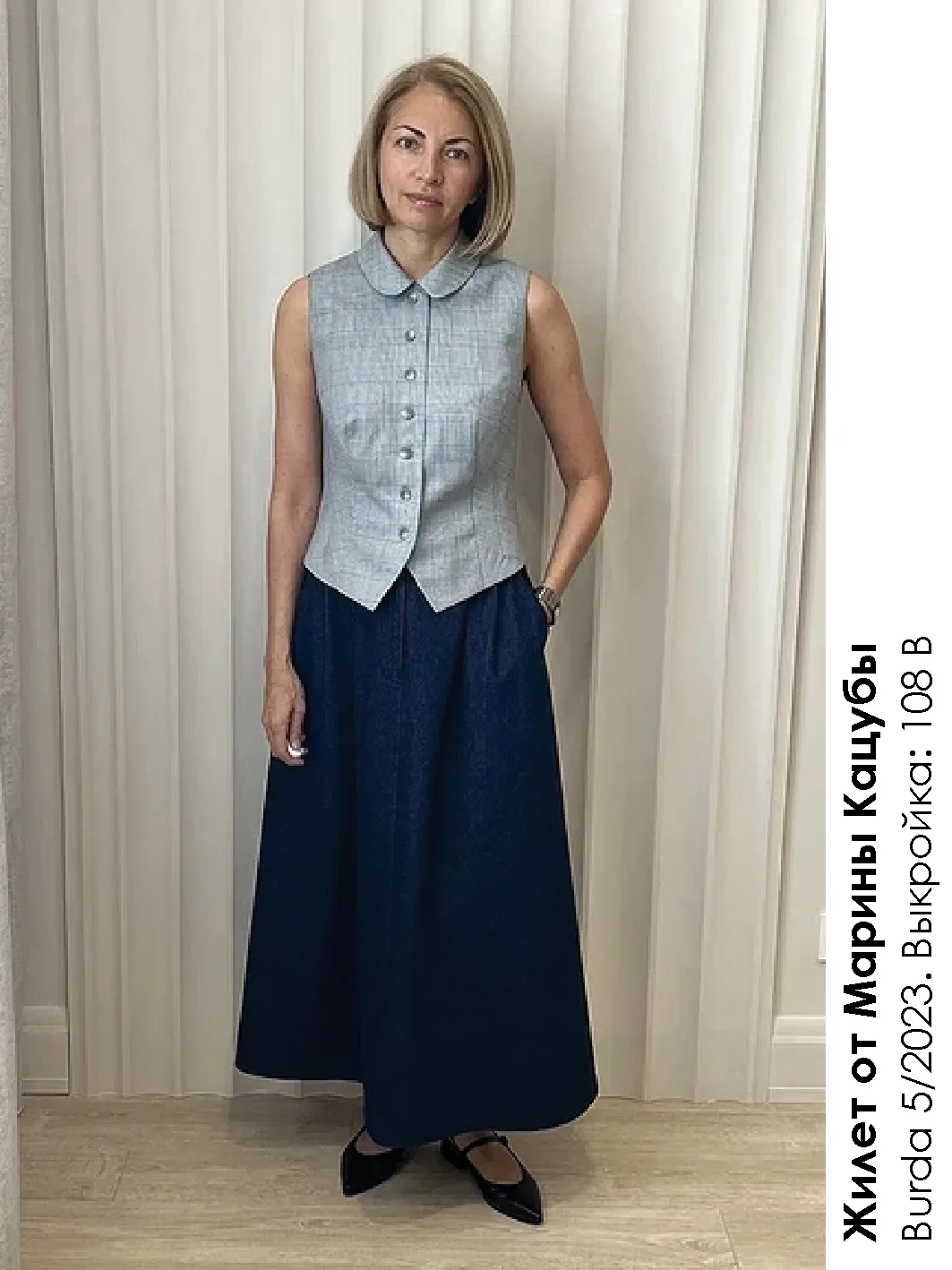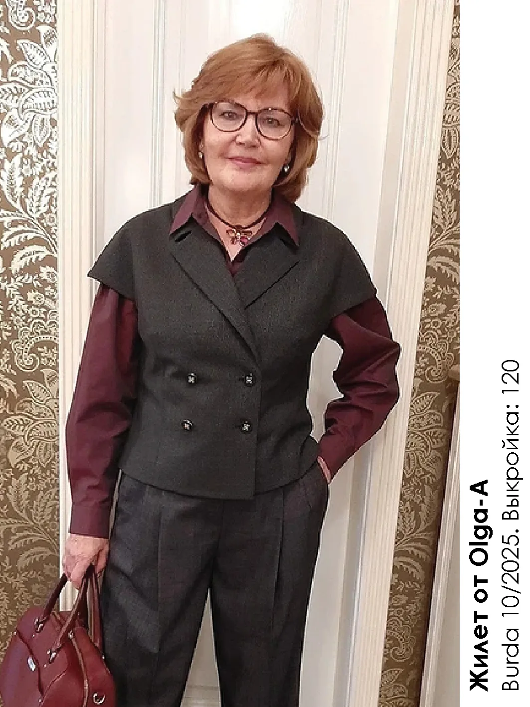 Наш двубортный жилет предполагал игривую асимметрию, но Ольга сделала ставка на классику — и не зря! Изделие получилось утонченным и универсальным, его легко представить и в офисном гардеробе, и в составе нарядного комплекта. В своей публикации наша героиня как раз демонстрирует, с какой легкостью жилет становится частью различных образов, привнося в каждый архитектурность.