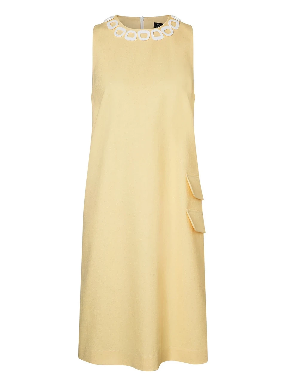 👉Баланс ретро и гламура вы найдете в прелестном мини-платье простого A-силуэта с углубленными проймами и декоративной отделкой небольшого выреза горловины. Еще одна изюминка этой модели в духе 60-х: ложные карманы с клапанами, расположенные с одной стороны.