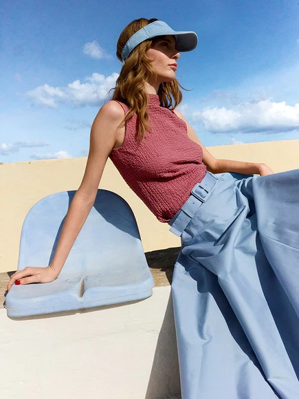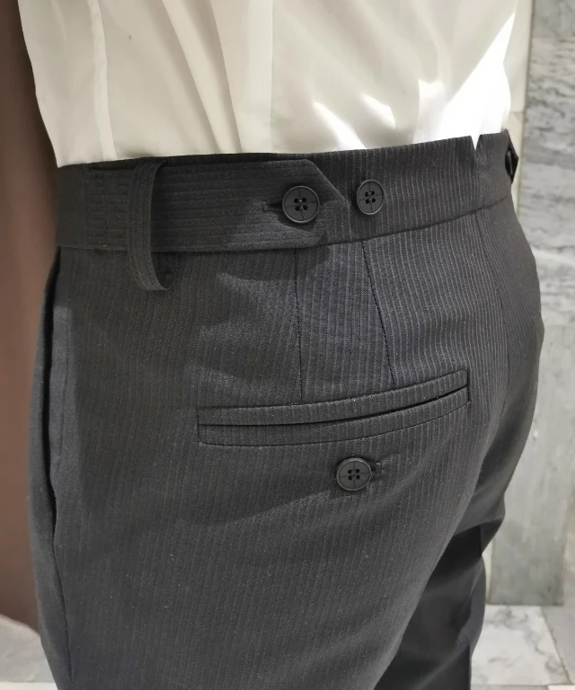 Прямые брюки слегка зауженные книзу, с высокой талией, заутюженными стрелками, задним поясом и фальшивыми карманами с листочками придают любому образу безупречную элегантность.