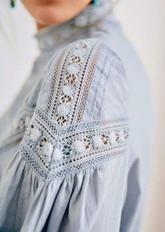 🔹 Прошва — это декоративное кружево может использоваться и как отдельное украшение, часто его дополняют продетыми в его отверстия шелковыми тесемочками. Но все же в основном оно предназначено для притачивания между двумя деталями одежды или прочего тканевого декора. Создается с помощью строчевой вышивки (см. ниже «Строчевая вышивка»).