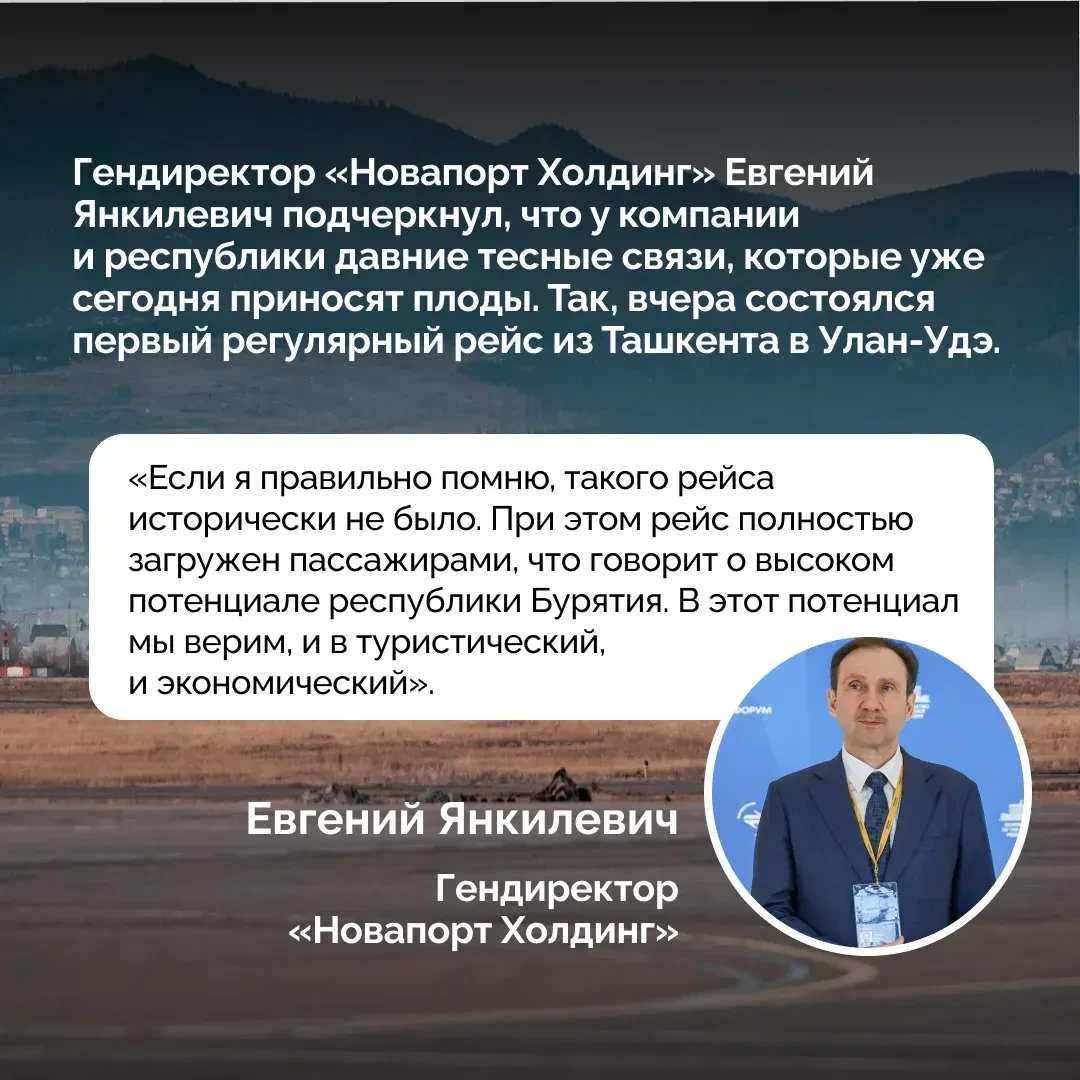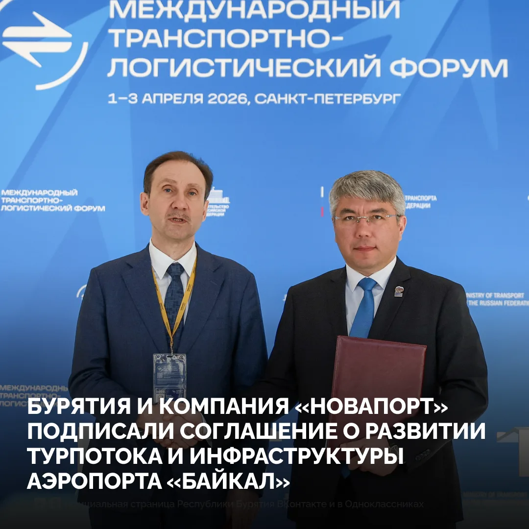 ✈ 1-3 апреля в Санкт-Петербурге проходит международный транспортно-логистический форум. На нем Глава Бурятии Алексей Цыденов и генеральный директор «Новапорт Холдинг» Евгений Янкилевич подписали соглашение о взаимодействии между Правительством республики и холдингом по развитию туристического потока в регионе и инфраструктуры международного аэропорта «Байкал».