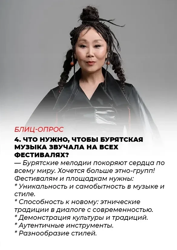 Намгар Лхасаранова в небольшом интервью ответила на вопросы о творческом становлении своего коллектива. Блиц-опрос можно посмотреть в карточках. ⬆