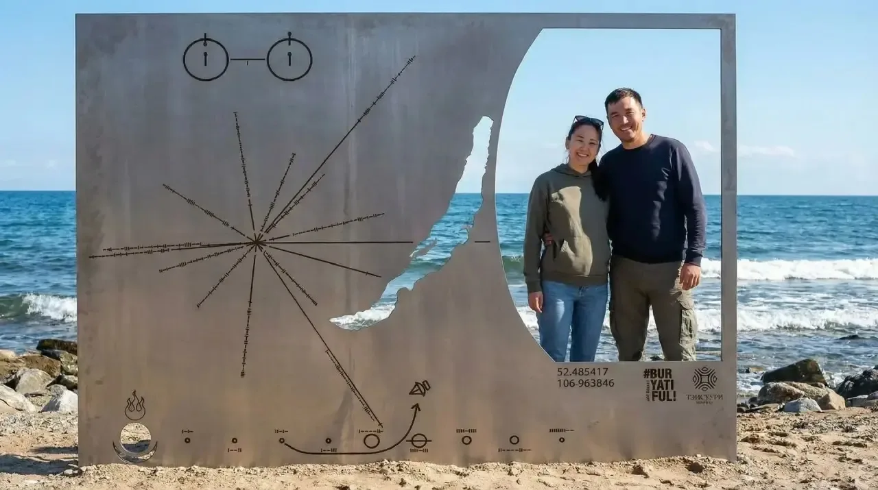 🌌 Автор инсталляции — художник Золто Цыбикжапов. Объект создан по мотивам легендарной «Пластины Пионера», отправленной в космос с зондами «Пионер-10» и «Пионер-11» в 1972 году. На пластине воспроизведены карта пульсаров, по которой можно определить положение Земли, схема Солнечной системы с траекторией полёта «Пионера» и многое другое.
