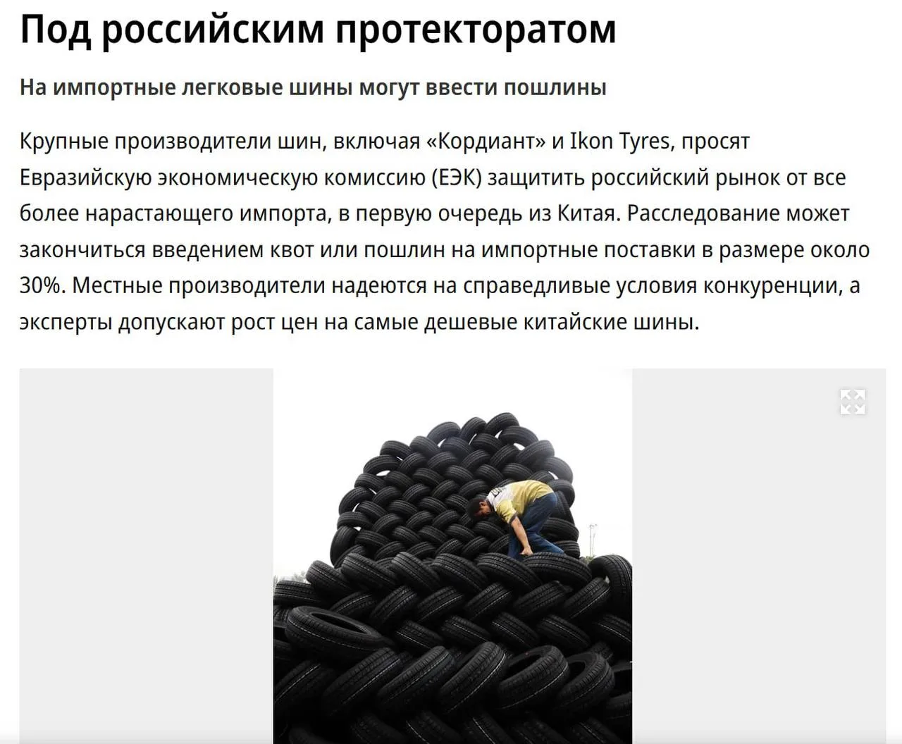 Российские производители шин обратились в Евразийскую экономическую комиссию с просьбой защитить российский рынок от импорта из Китая, сообщает «Коммерсантъ». Расследование может закончиться введением квот или пошлин на импортные поставки в размере около 30%.