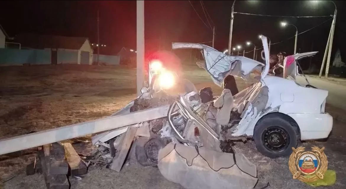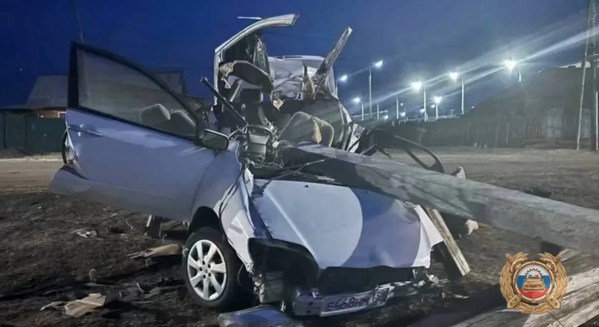 Сегодня ночью недалеко от посёлка Баяндай парень за рулём Toyota Corolla не справился с управлением и влетел в опору ЛЭП. От удара столб упал прямо на иномарку — автомобиль смяло.