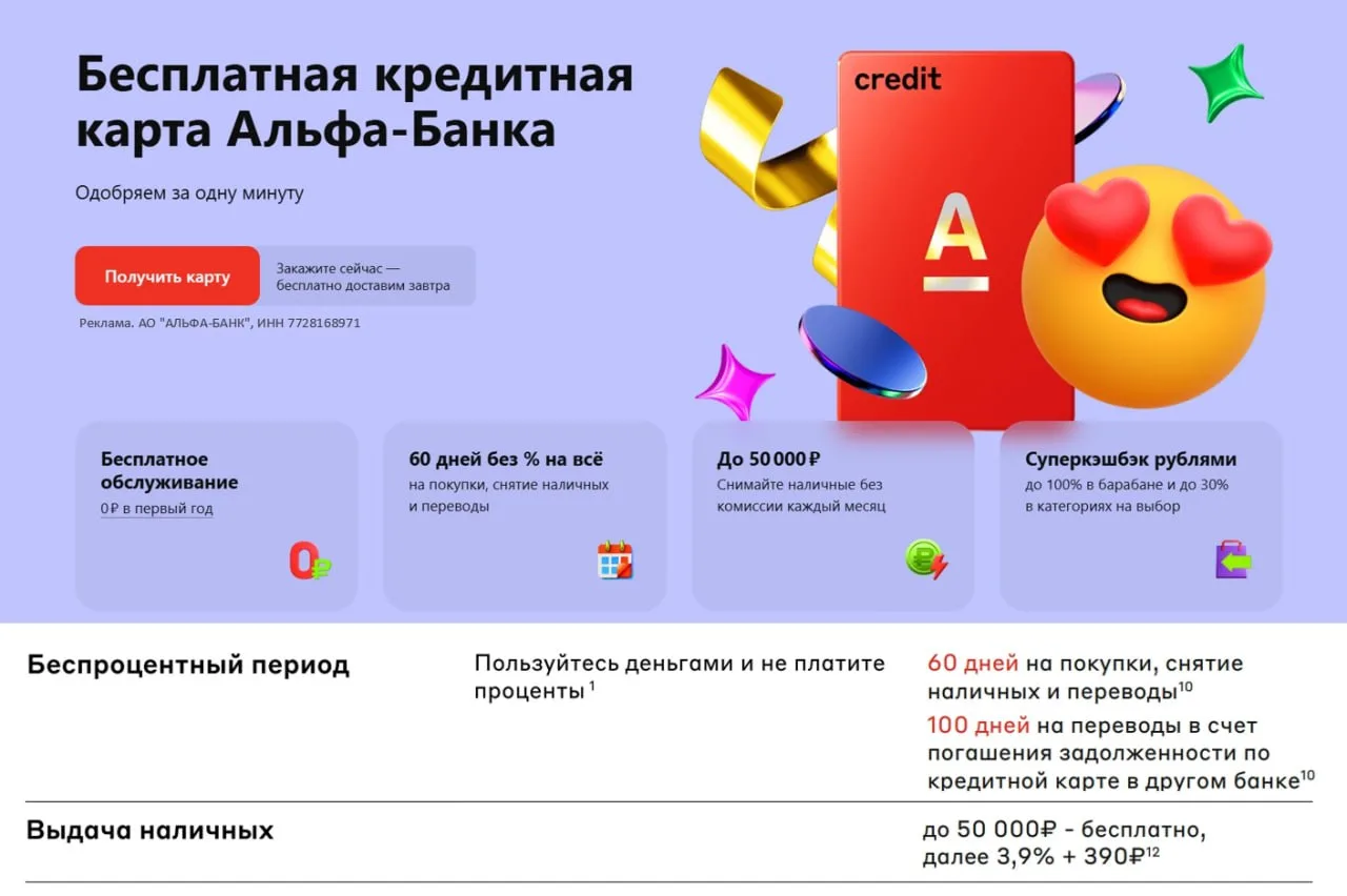 ⚡️Альфа-Банк выпускает кредитку со снятием заёмных средств до 50к/мес в банкоматах любых банков без комиссии и в грейс 60 дней. Деньги в течение этого беспроцентного периода можно размещать на накопительных счетах, получая доход за счёт средств банка.