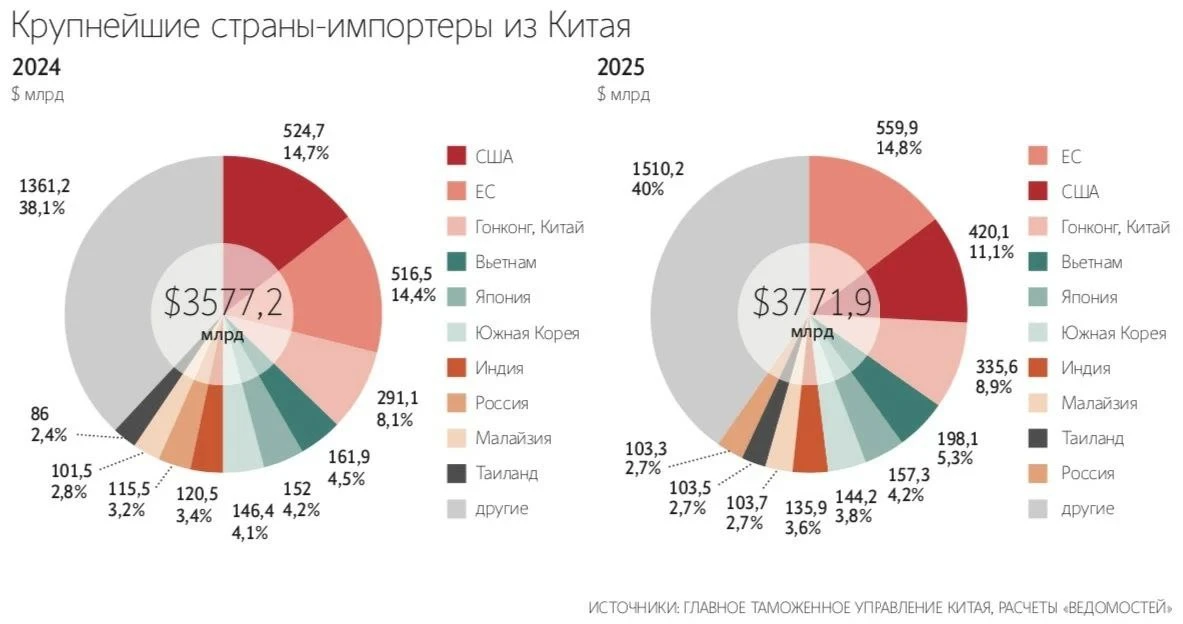 Китайский экспорт, несмотря на торговую войну, за 2025 г. вырос на 5,5% год к году ($3,77 трлн), а импорт остался на уровне 2024 г. ($2,58 трлн).