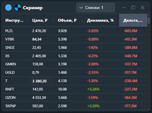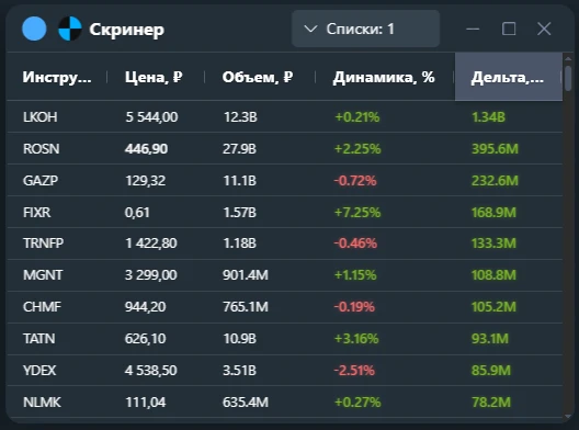 Дельта — разница между рыночными покупками и продажами. Показывает истинную рыночную активность и настроение на в акциях.