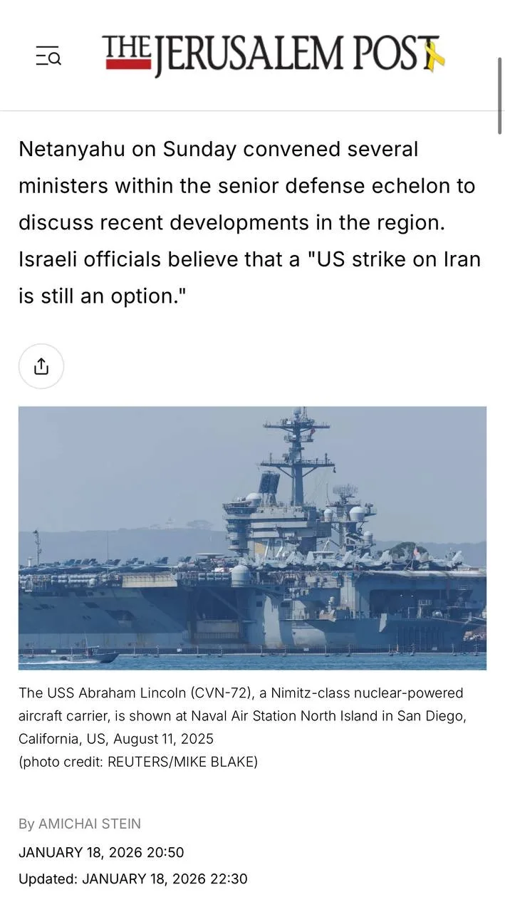 Авианосец и ударная группа войдут в зону Центрального командования США через пять-семь дней. Авианосец сопровождают два эсминца: USS Spruance и USS Michael Murphy — The Jerusalem Post.