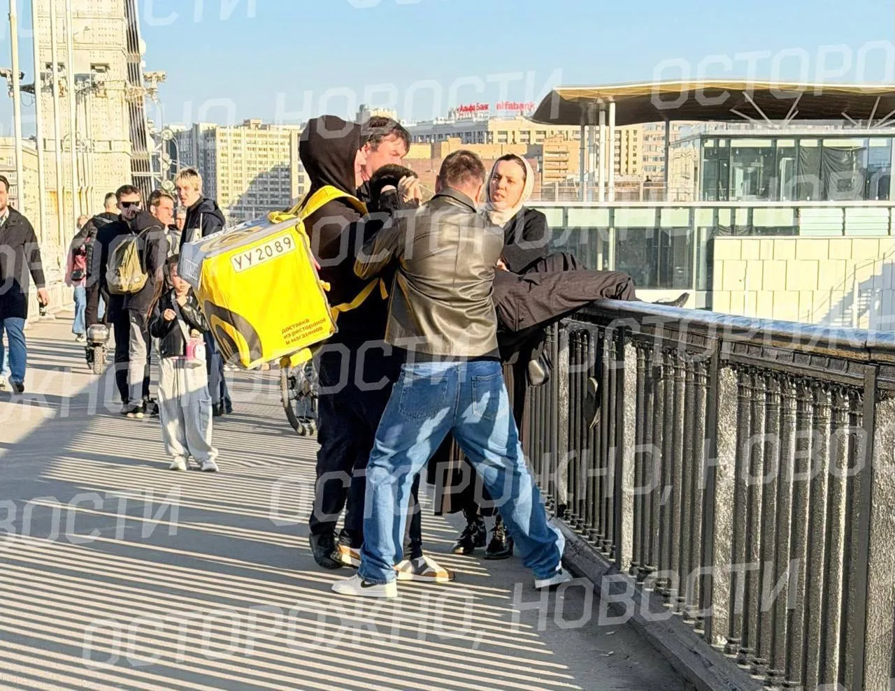 Мужчина шел по мосту у Парка Горького и заметил молодого парня, который сидел на ограждении, свесив ноги. Поняв, что молодой человек собирается спрыгнуть в реку, курьер подбежал и схватил его.