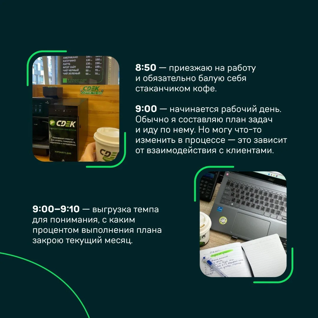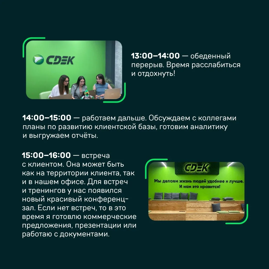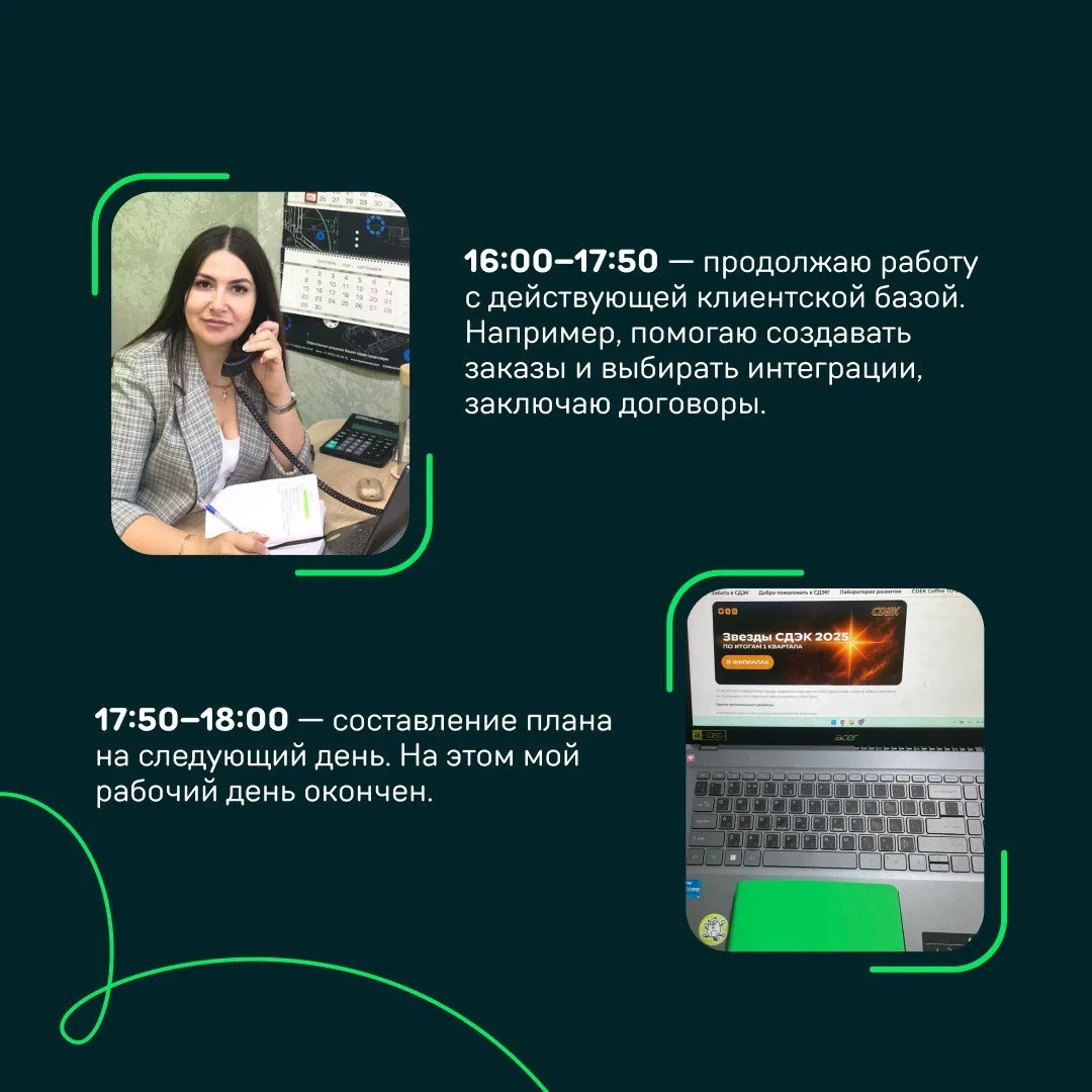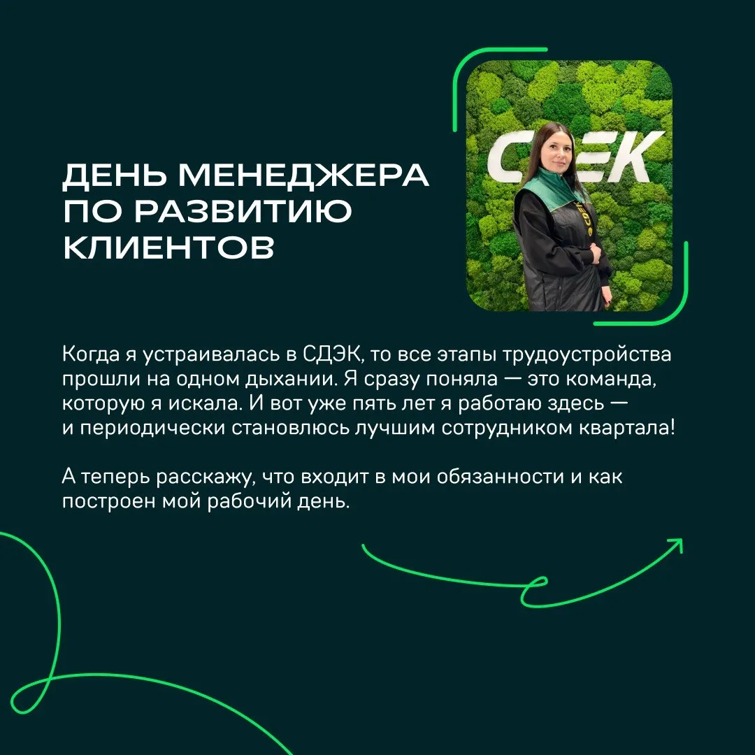 Это всё — секрет успешного рабочего дня Ольги Гордеевой, менеджера по развитию клиентов из Челябинска. Она пришла в СДЭК в 2020 году. И с тех пор каждый день она помогает клиентам сделать их бизнес эффективнее.