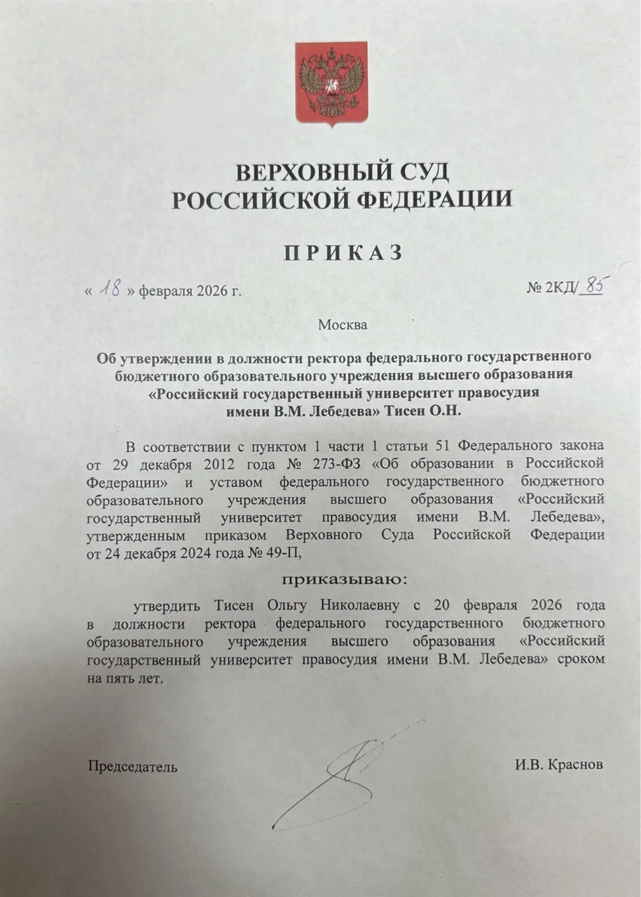 Игорь Краснов назначил Ольгу Тисен ректором Российского государственного университета правосудия им. В. М. Лебедева. Она является автором более 200 научных публикаций, занимает пост консультанта ООН по противодействию использования криптовалют в преступных целях.
