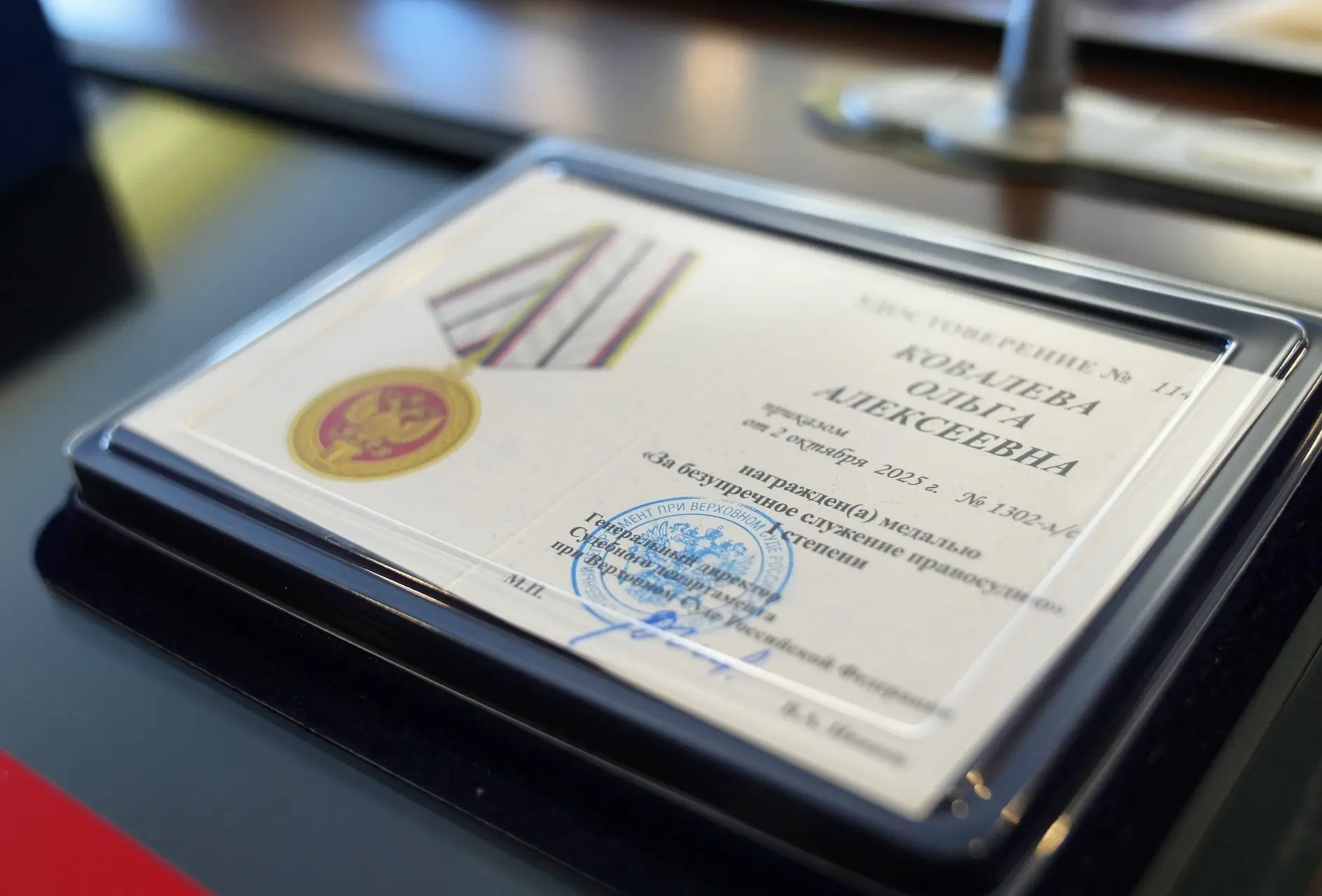 За долголетнее и образцовое исполнение служебных обязанностей, значительный вклад в развитие судебной системы Генеральный директор Судебного департамента вручил Ольге Алексеевне заслуженные награды – медаль «За безупречное служение правосудию» I степени и высшую награду в сфере строительства – знак «Почетный строитель России».