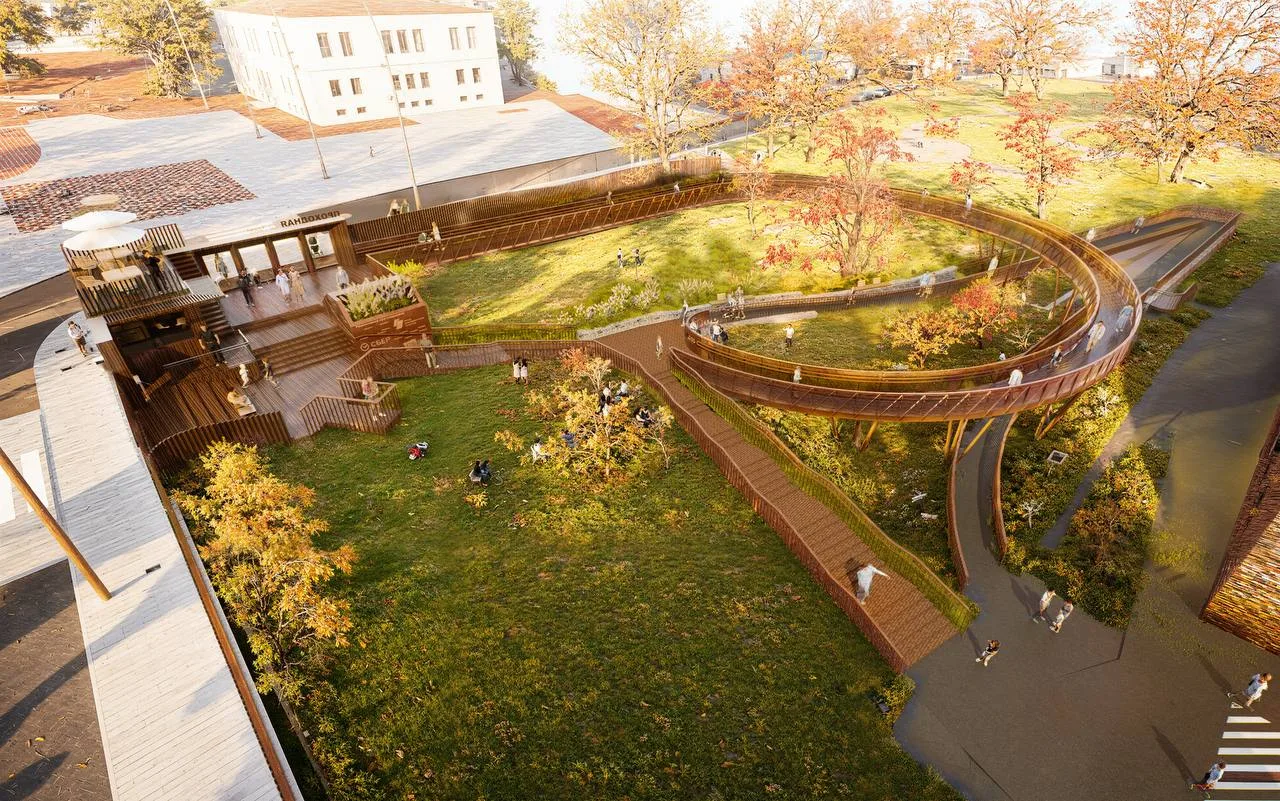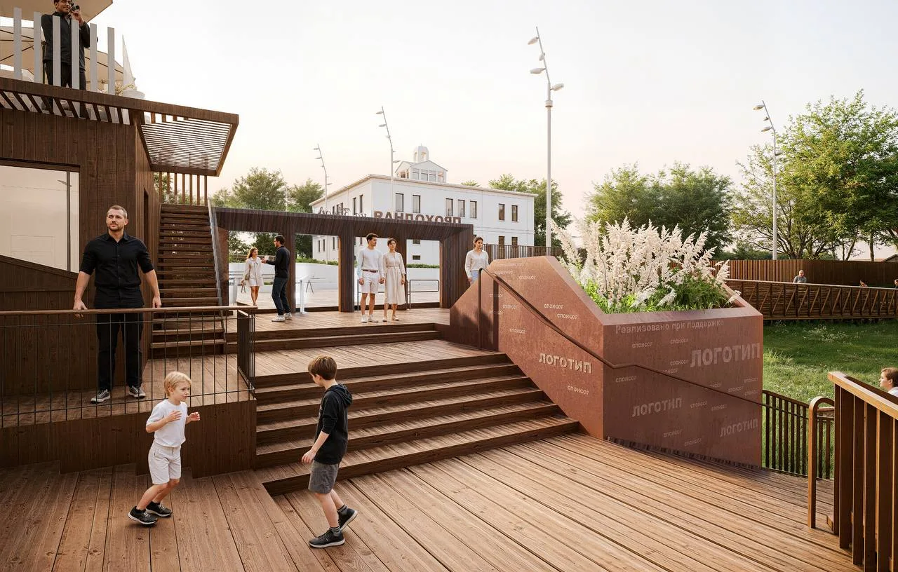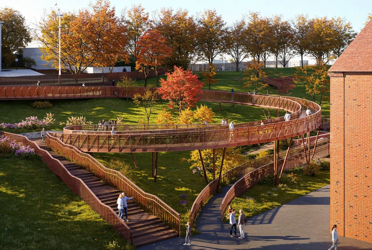 Появится 200-метровая лестница с парящим пандусом — удобная для колясок, пожилых и инвалидов. Сейчас вход только по временной гравийной лестнице через овраг.