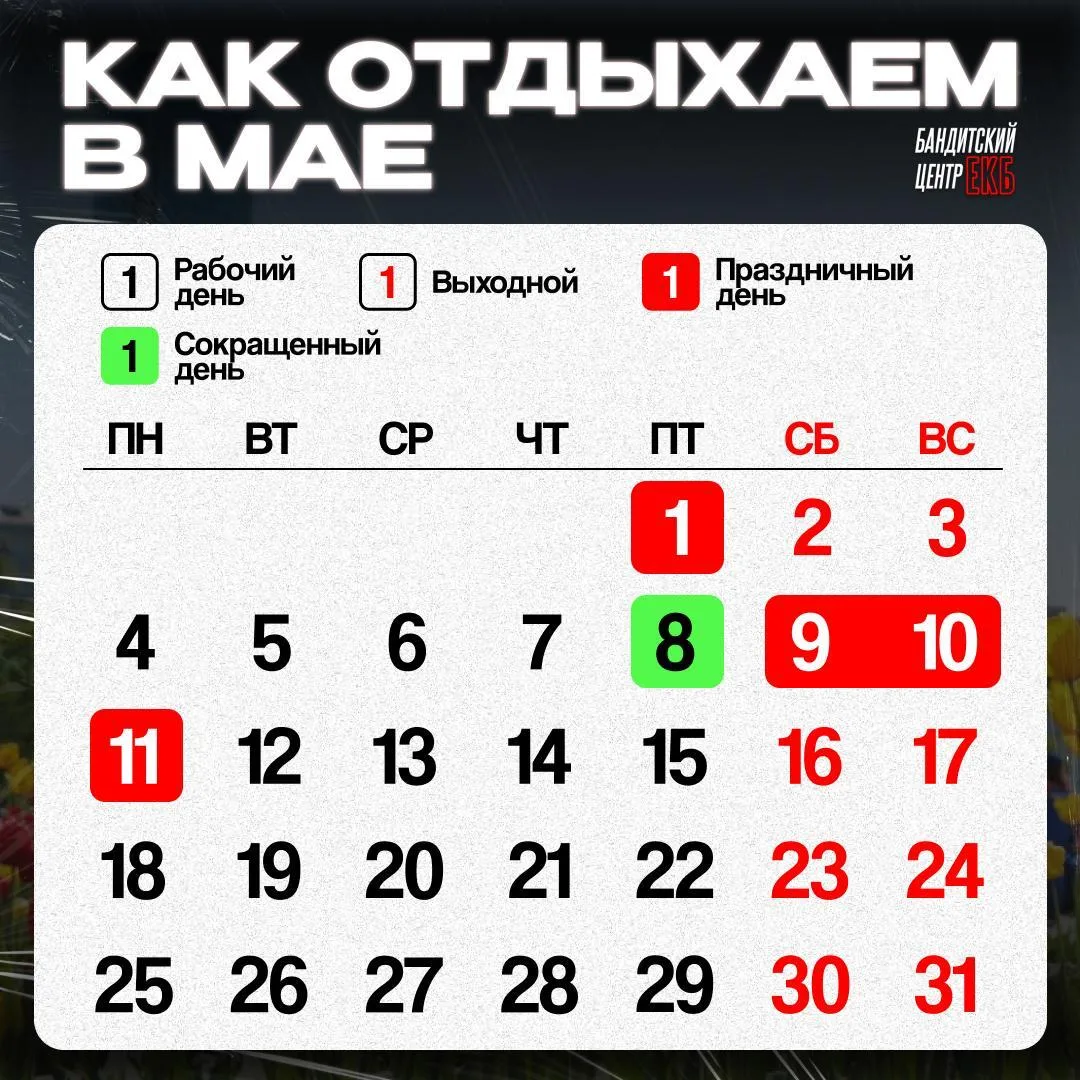 К обычным выходным добавятся праздничные дни с 1 по 3 мая (Праздник Весны и Труда) и с 9 по 11 мая (День Победы).