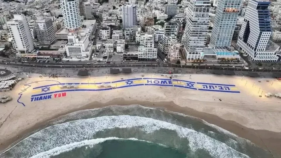 Самолет Дональда Трампа приземлился в израильском аэропорту Бен-Гурион. В связи с прибытием лидера США на пляже в Тель-Авиве установили огромный баннер с благодарностью за урегулирование конфликта в секторе Газа.