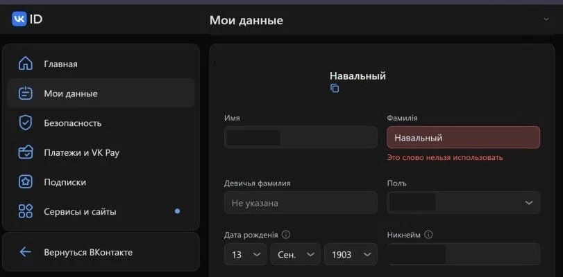 Выяснилось, что в социальной сети VK пользователи не могут использовать при создании нового профиля ряд фамилий, в их число входят: Навальный, Путин, Гитлер и Сталин.
