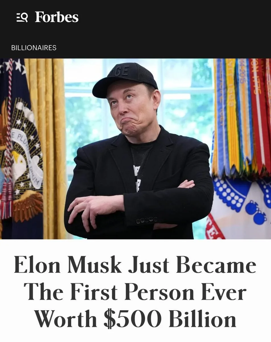 Илон Маск стал первым человеком, чьё состояние достигло 500 миллиардов долларов, сообщает Forbes. Отметка была преодолена 1 октября 2025 года. На это повлияли рост акций Tesla и увеличение стоимости других компаний, принадлежащих Маску, включая SpaceX и xAI.