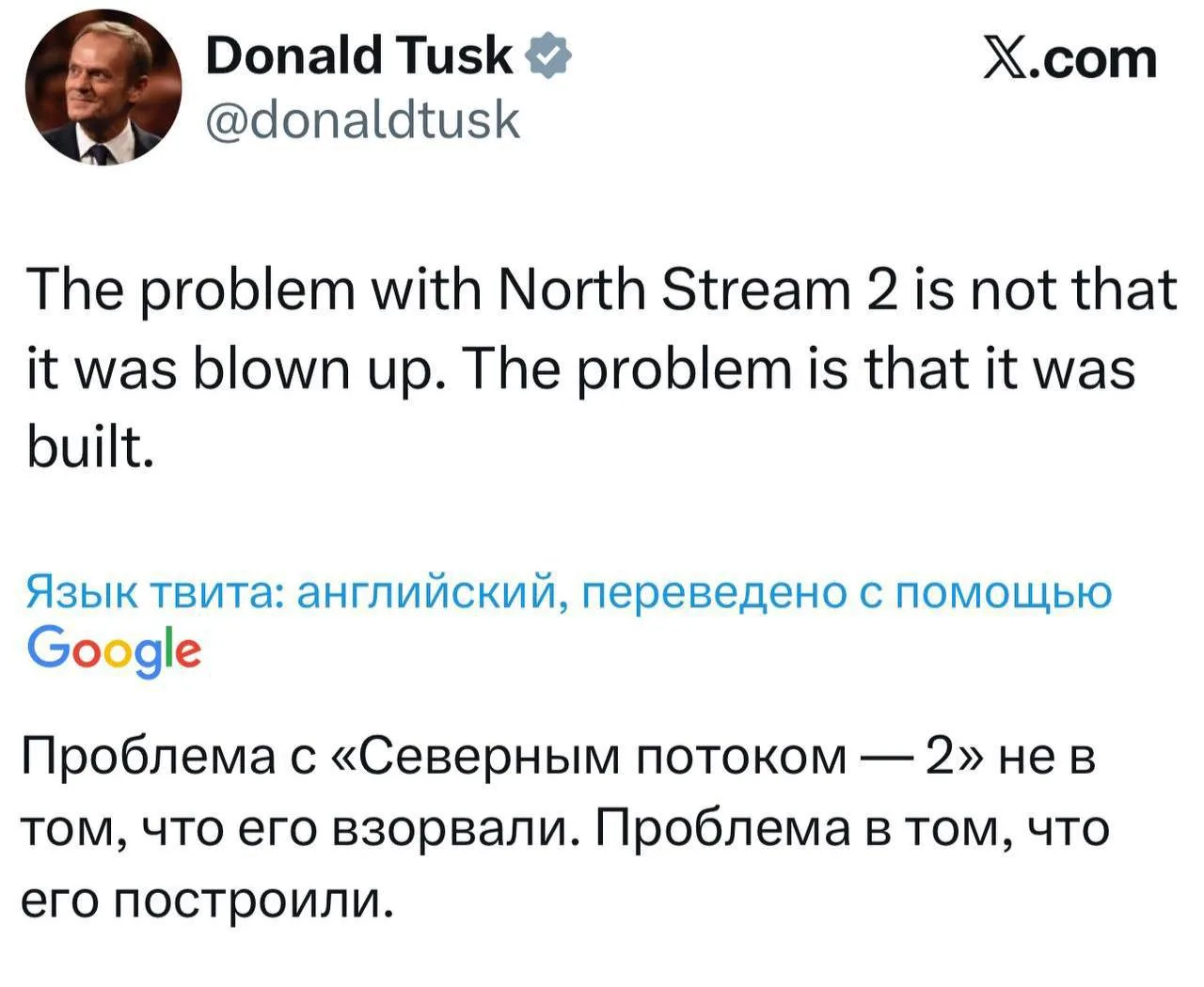 Премьер Польши Туск: «Проблема с "Северным потоком — 2" заключается не в том, что его взорвали, а в том, что его вообще построили».
