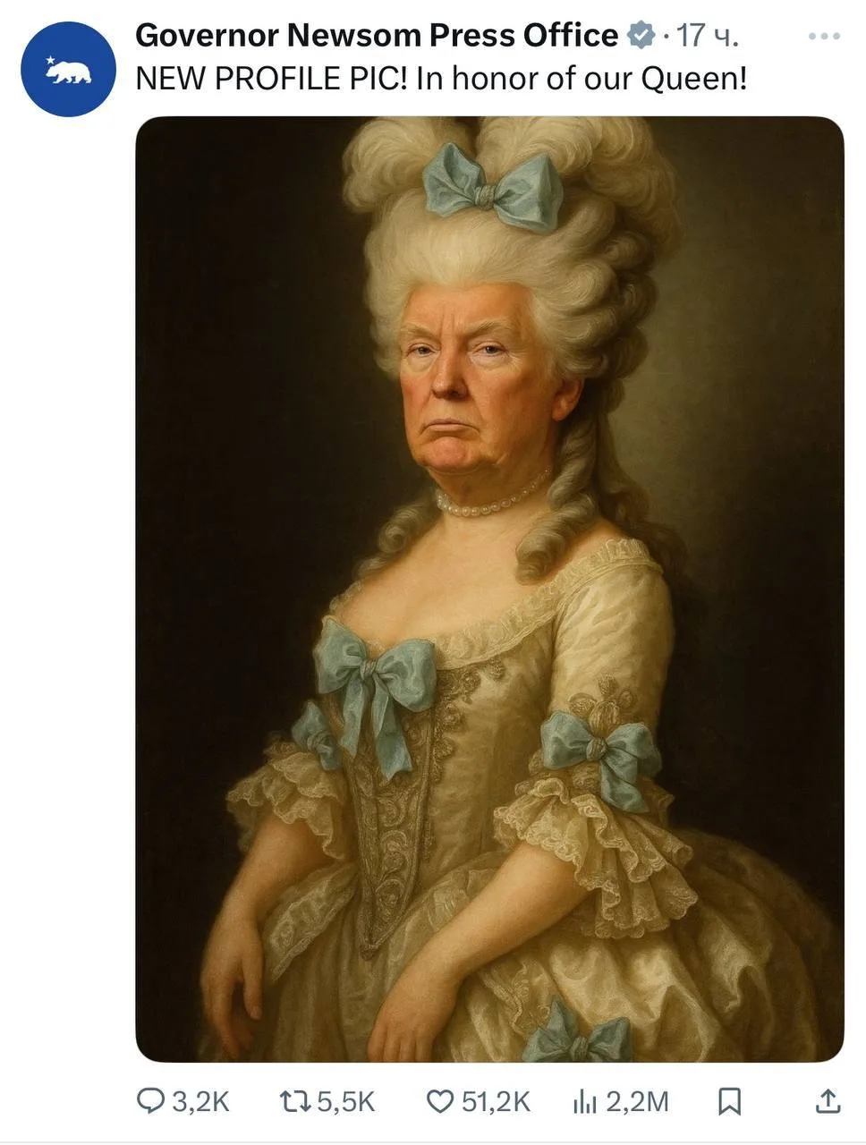 Губернатор Калифорнии Гэвин Ньюсом опубликовал в соцсети изображение Дональда Трампа в костюме европейской королевы из XVIII века.