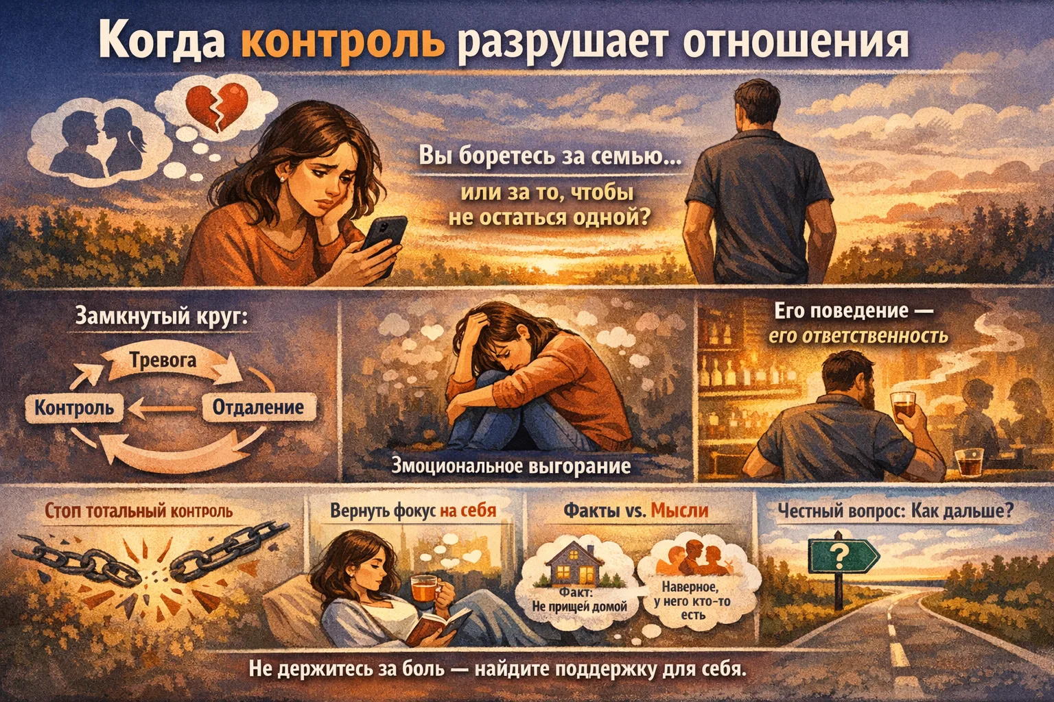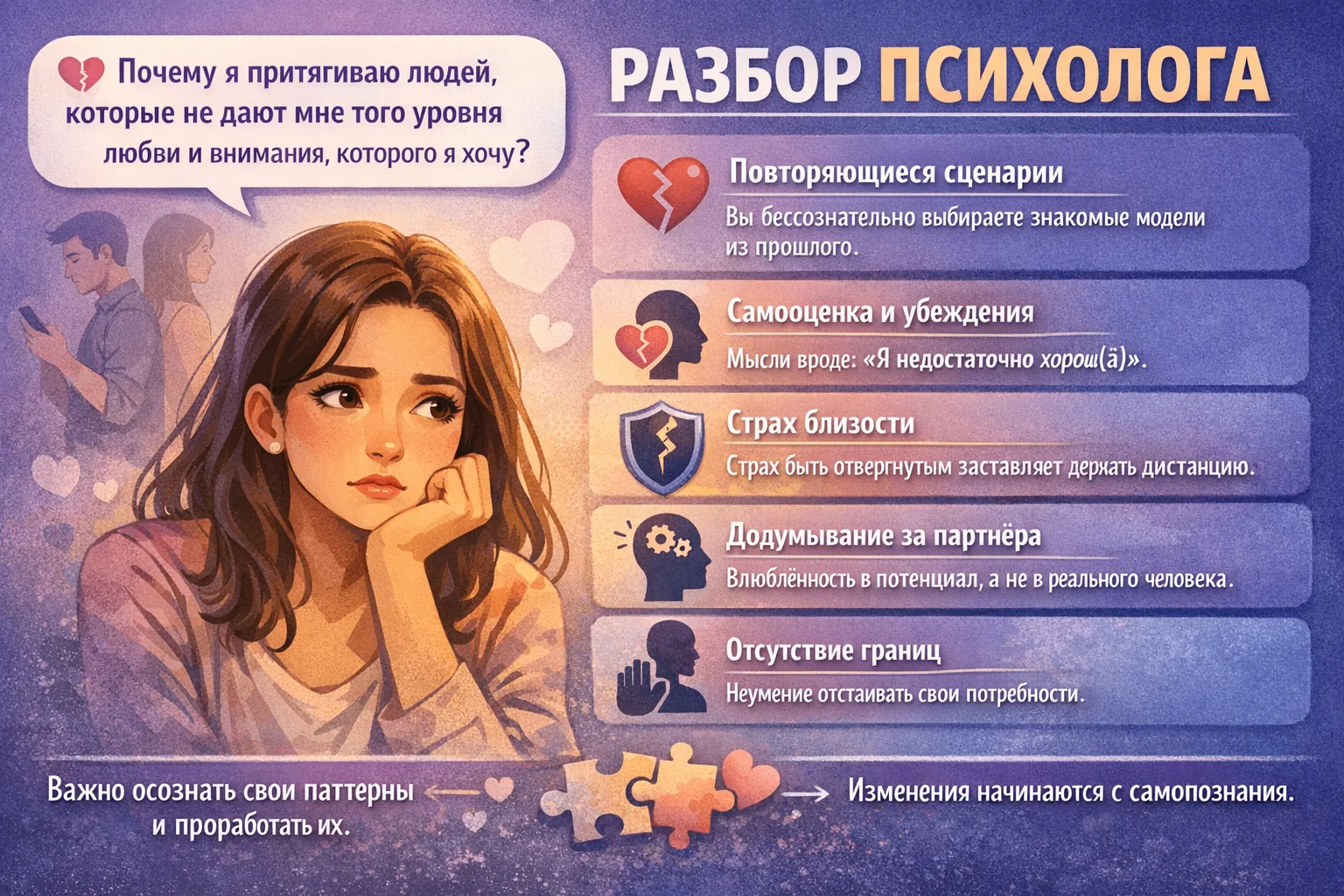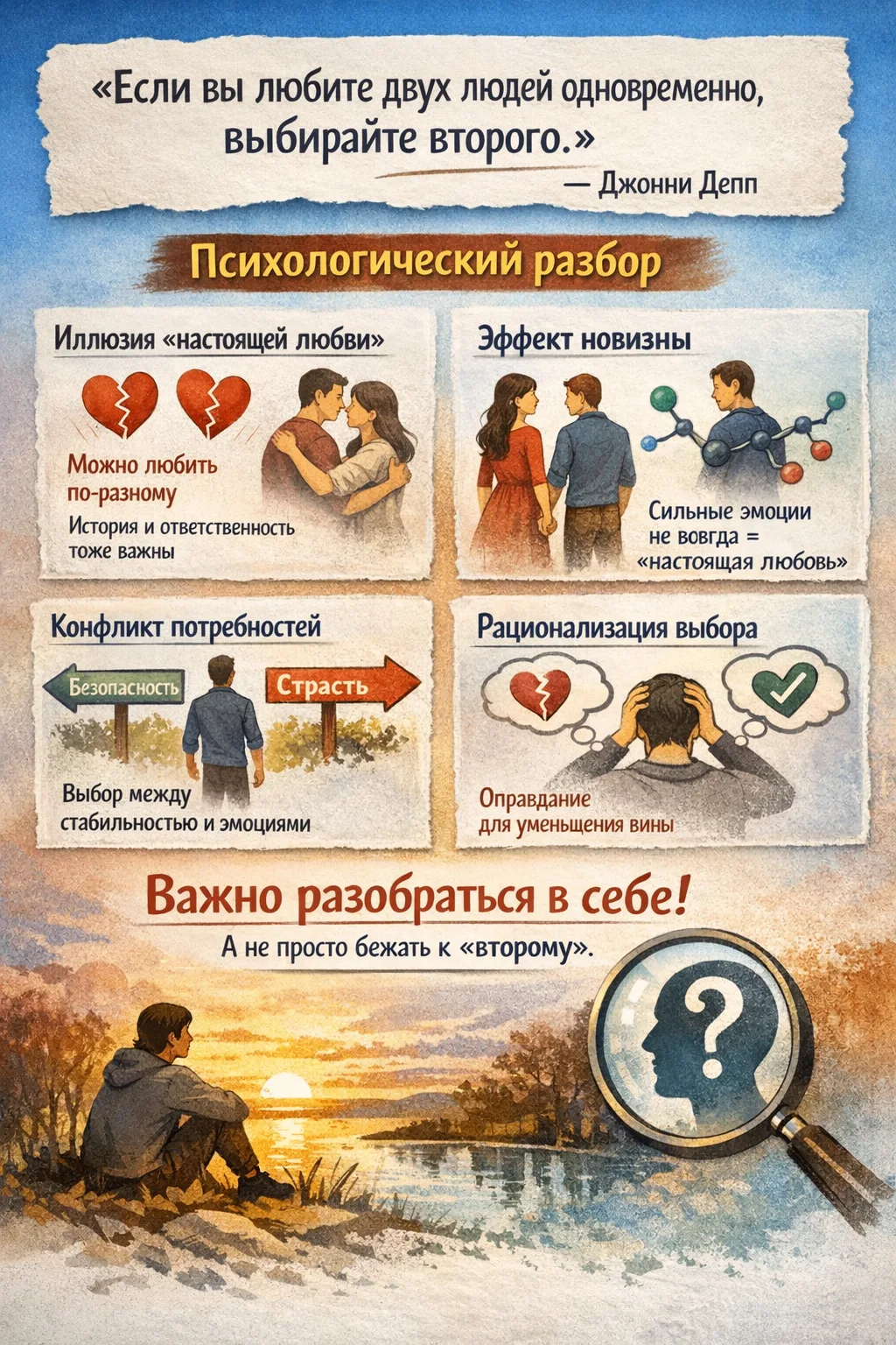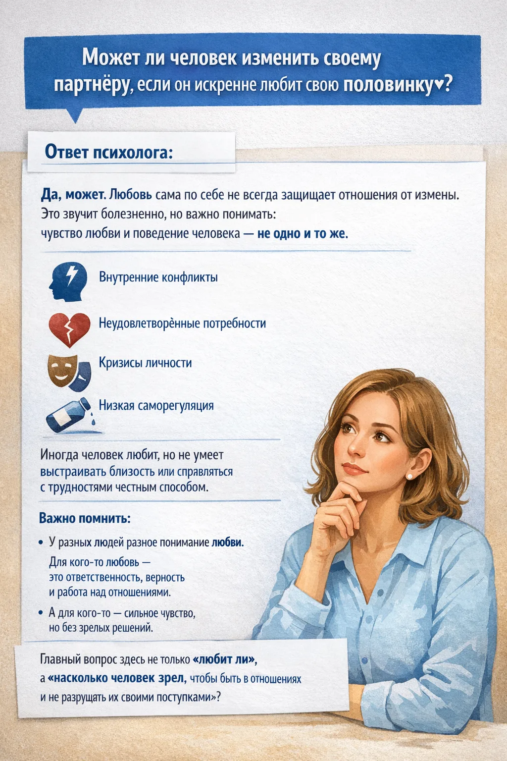 Также важно учитывать, что у разных людей разное понимание любви. Для кого-то любовь — это ответственность, верность и работа над отношениями, а для кого-то — сильное чувство, но без зрелых решений и границ.