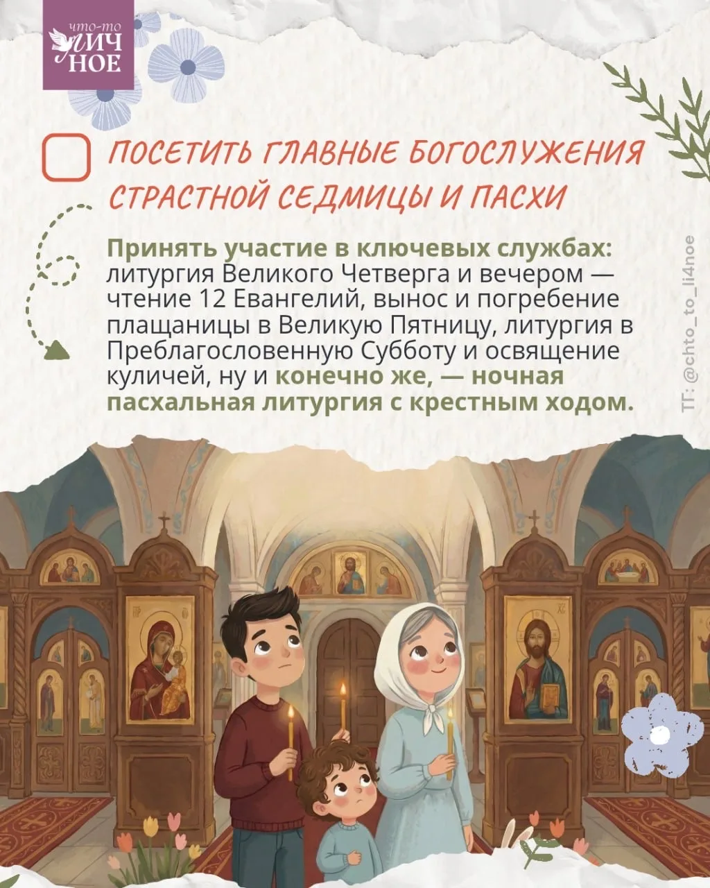К Пасхе службы становятся чаще. В оставшиеся дни Страстной седмицы прекрасно посетить богослужения. Например, литургию Великого Четверга и вместе причаститься, в пятницу вечером сходить на крестный ход с погребением Плащаницы, взяв с собой фонарики или свечки, а в субботу утром — освятить пасхальную еду: куличи и яйца.
