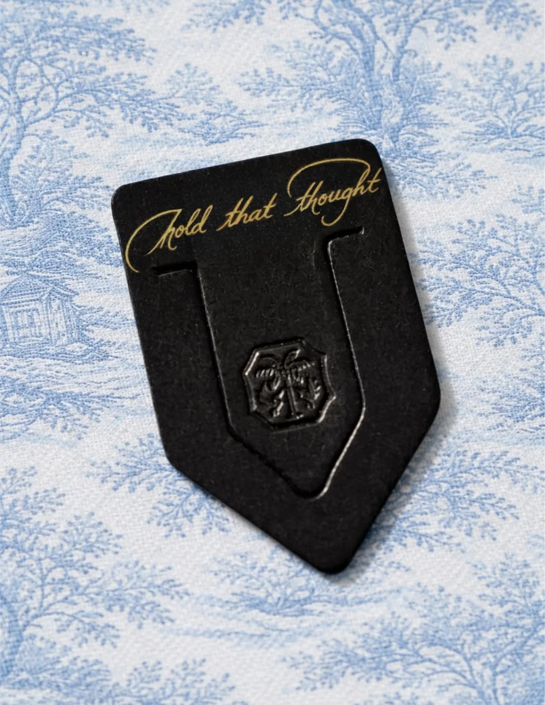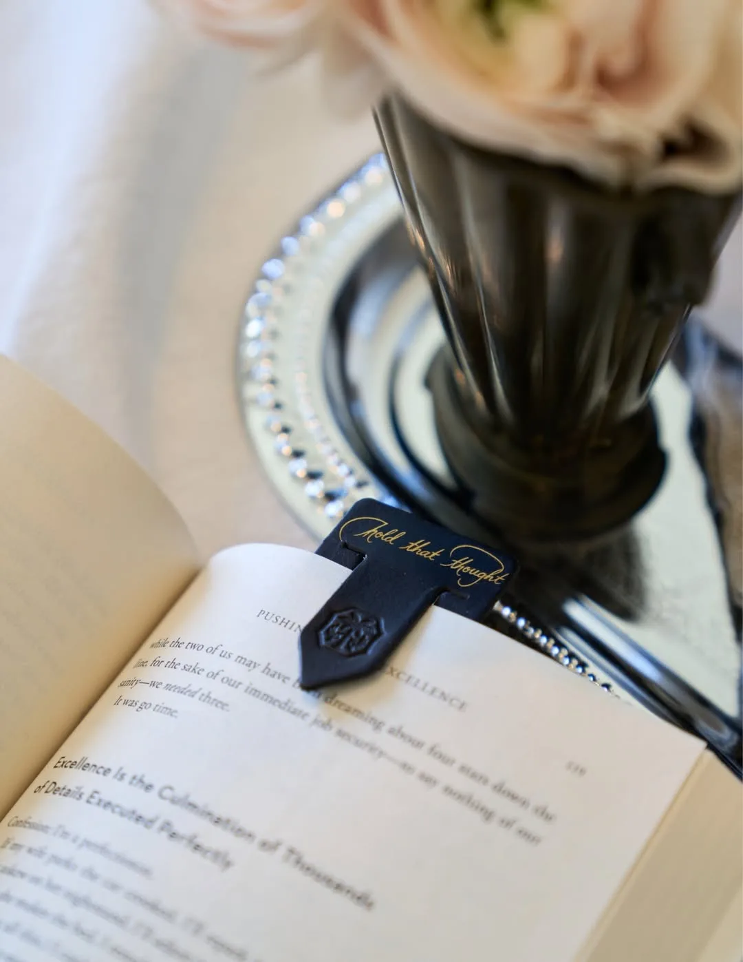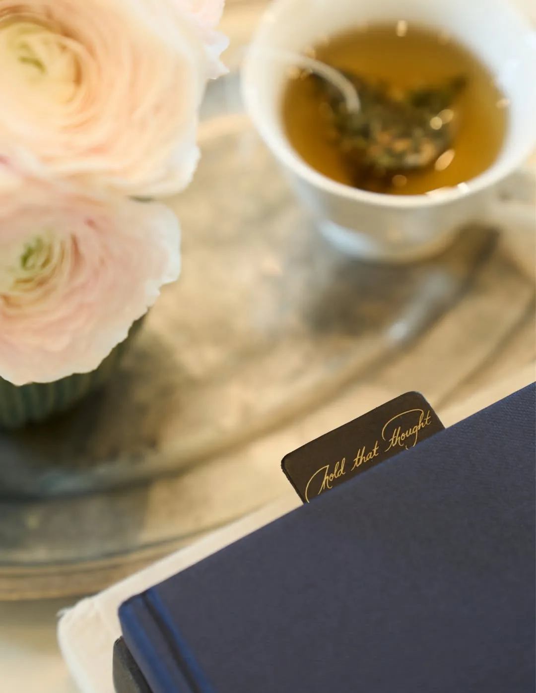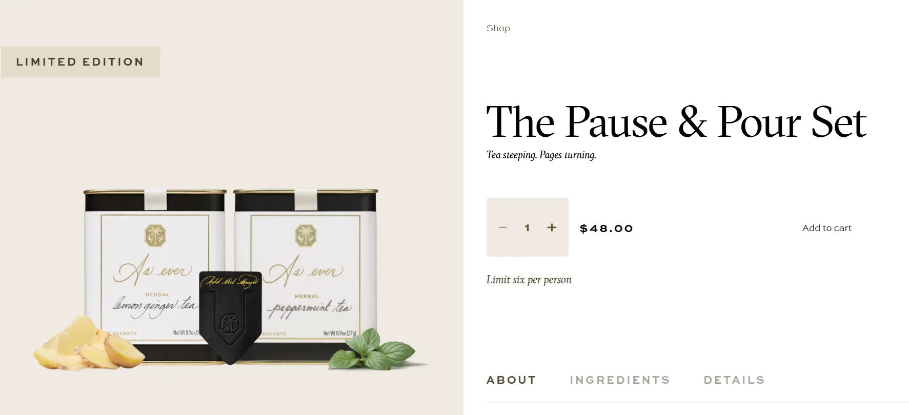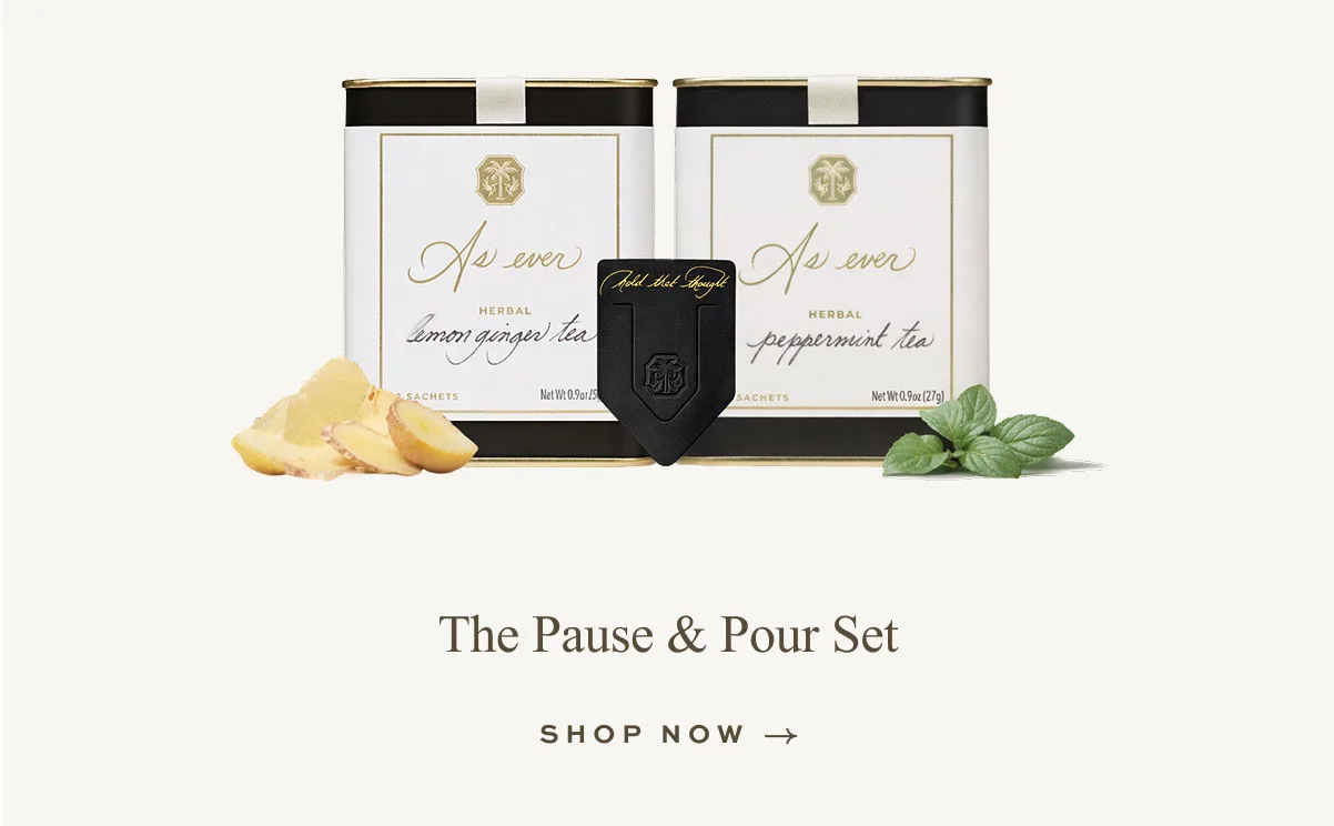 "Представляем набор Pause & Pour ("Сделай паузу и налей"), в котором собрано все необходимое для того, чтобы насладиться моментом тишины, держа в руке что-нибудь теплое. Наша новейшая кожаная закладка “Запомните эту мысль” лежит именно там, где вы ее оставили, а яркий лимонно-имбирный чай и охлаждающий мятный настой подарят вам уют в чашке".
