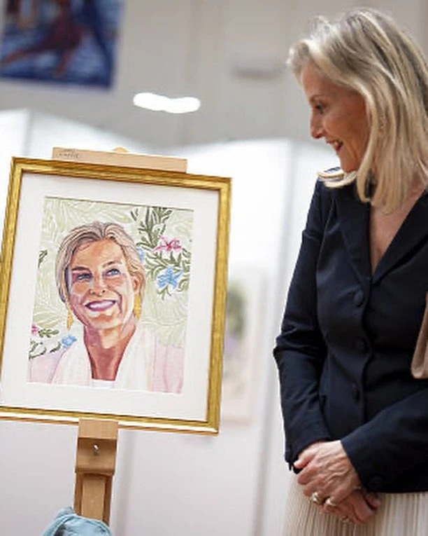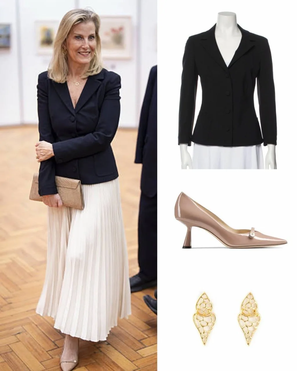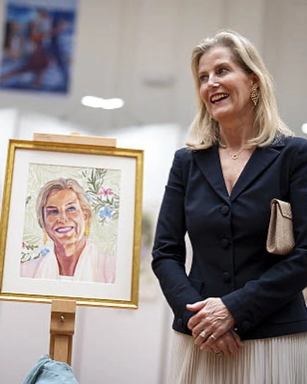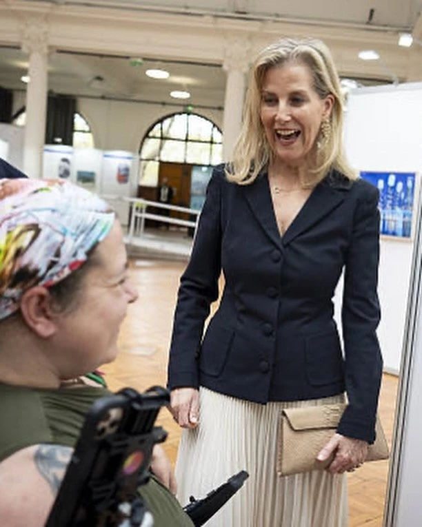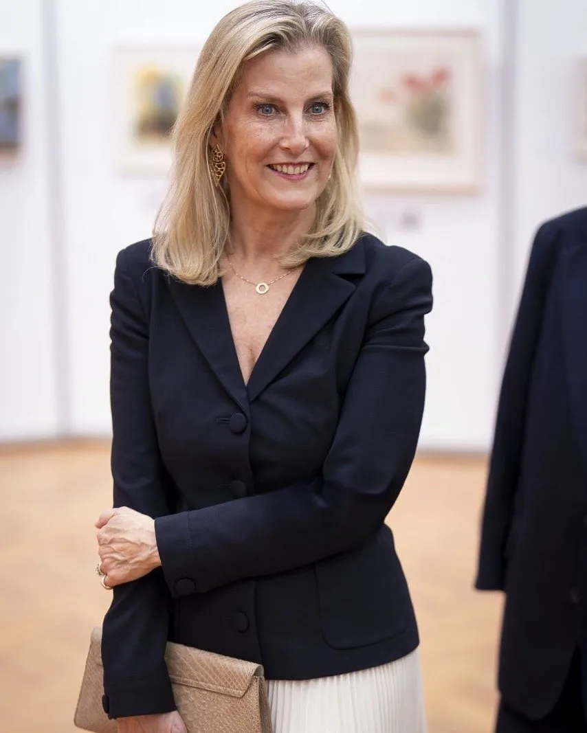 👗 Образ Софи, герцогини Эдинбургской на специальном показе выставки "Преодолевая границы, определяя искусство: 70 лет художников, рисующих ртом и ногами" в зале Линдли в Королевских садоводческих залах, Лондон, 15 апреля: блейзер Prada, клатч Sophie Habsburg, туфли Jimmy Choo, серьги Giulia Barela.
