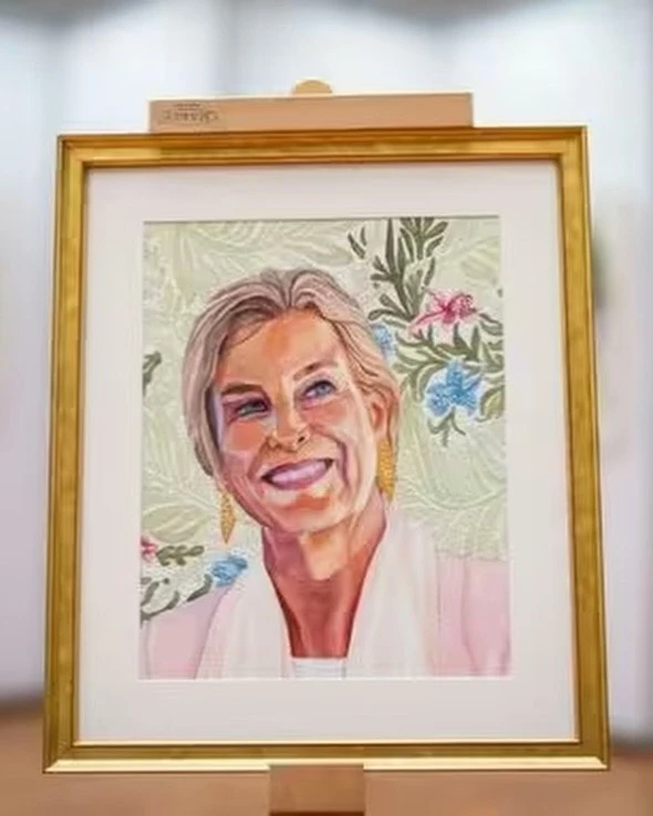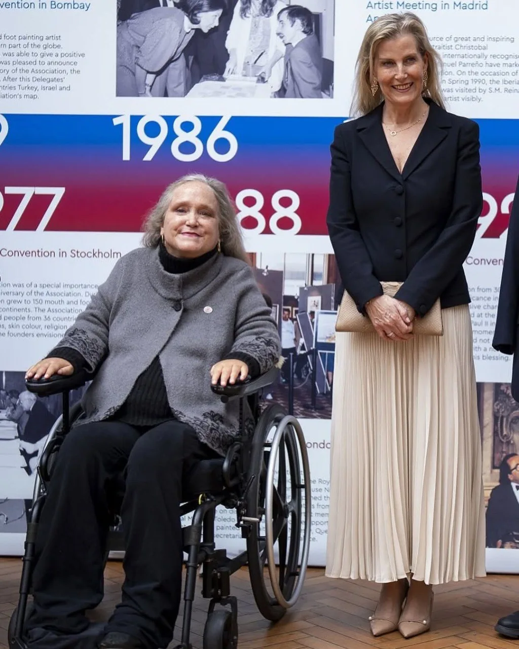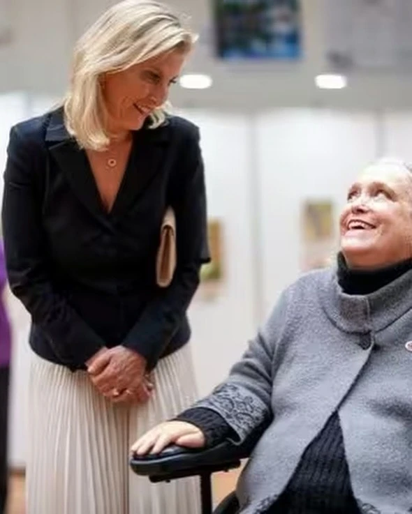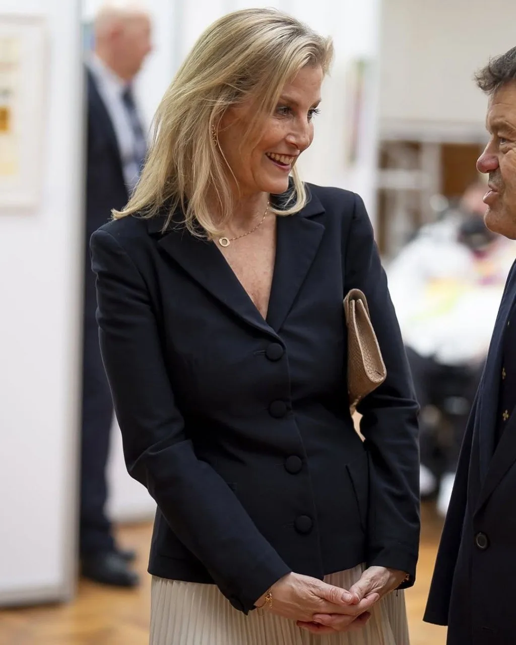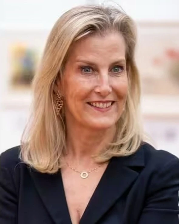 👗 Образ Софи, герцогини Эдинбургской на специальном показе выставки "Преодолевая границы, определяя искусство: 70 лет художников, рисующих ртом и ногами" в зале Линдли в Королевских садоводческих залах, Лондон, 15 апреля: блейзер Prada, клатч Sophie Habsburg, туфли Jimmy Choo, серьги Giulia Barela.