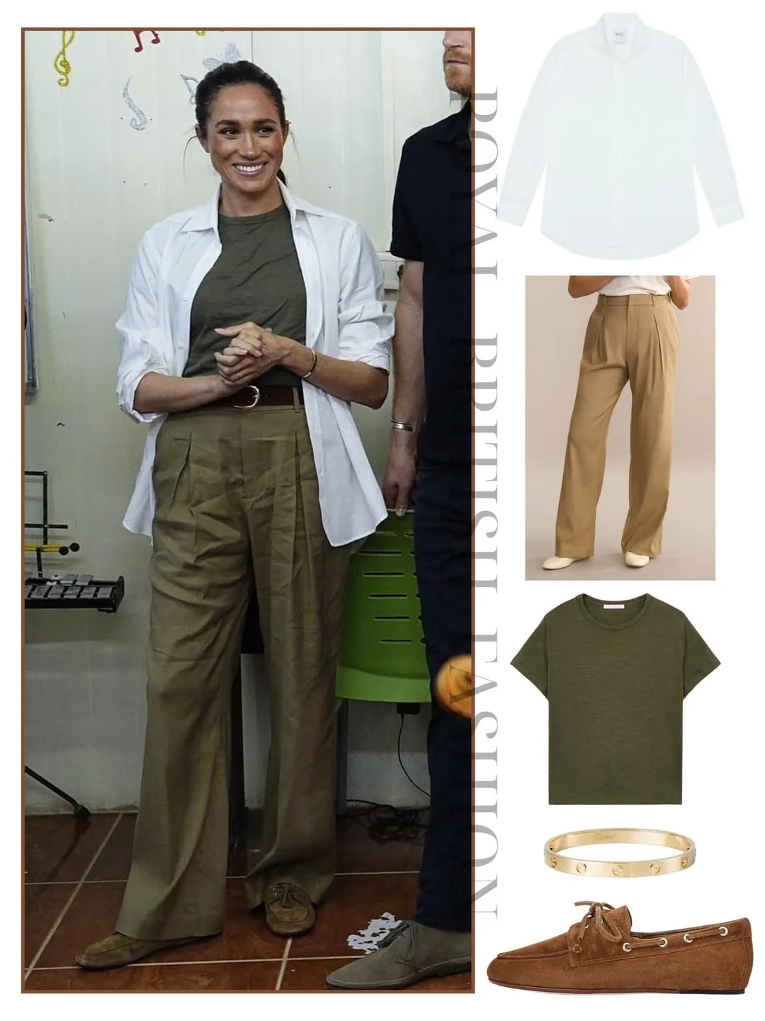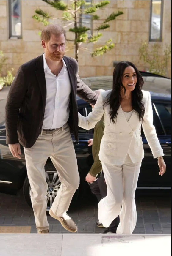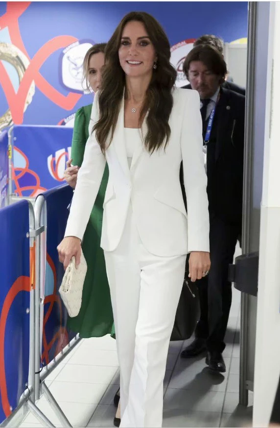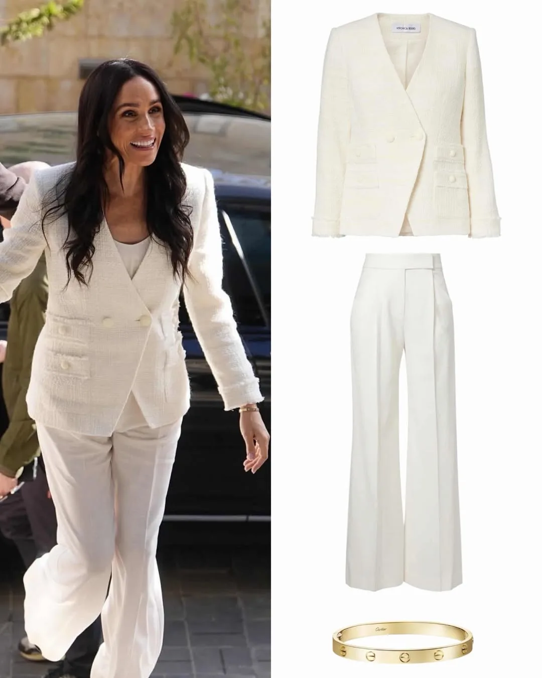 Герцогиня продемонстрировала безупречный образ деловой женщины, который оказался действительно очень удачным. Это белый брючный комплект от Veronica Beard, состоящий из двубортного жакета и свободных брюк в сочетании с белой блузкой. Такой стиль мы уже видели у Кейт Миддлтон задолго до Меган".