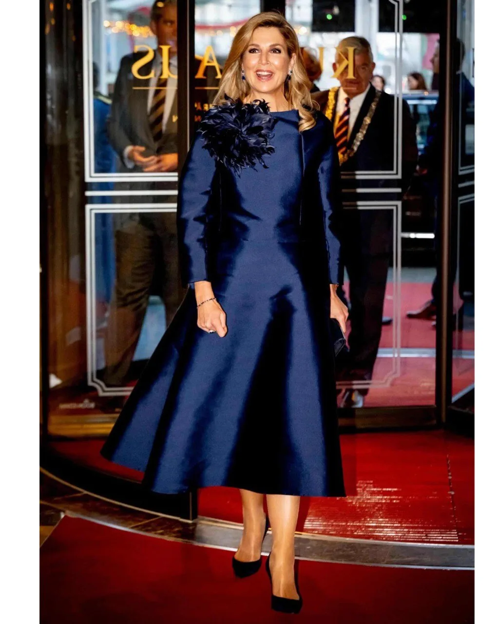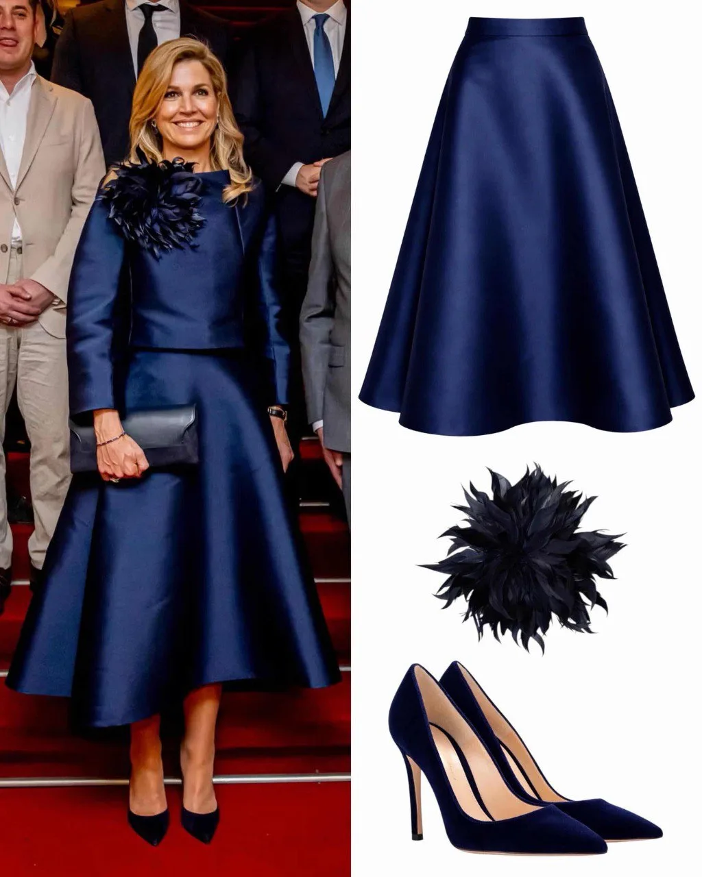 Для этого мероприятия Максима выбрала блузку, юбку и брошь-цветок от Natan Couture и туфли-лодочки Gianvito 105 из темно-синего бархата от Gianvito Rossi.