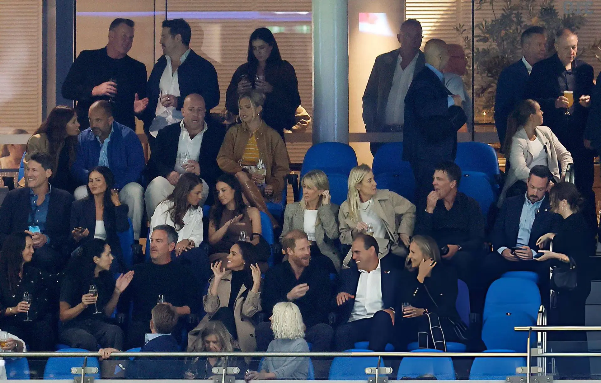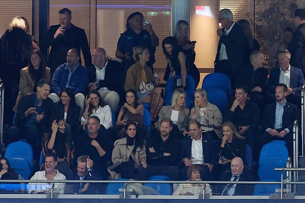 🔥 А Меган уже разделалась с ретритом - и они с Гарри и Маркусом Андерсоном смотрят матч по регби! Глаз да глаз за мадам...