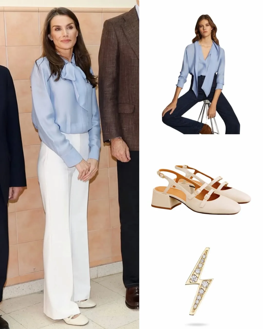 👗 Образ Летиции: блузка Massimo Dutti, туфли Sezane, серьги Little Iconic в виде молнии из золота и бриллиантов от Barbara Goenaga. ⬇️⬇️⬇️