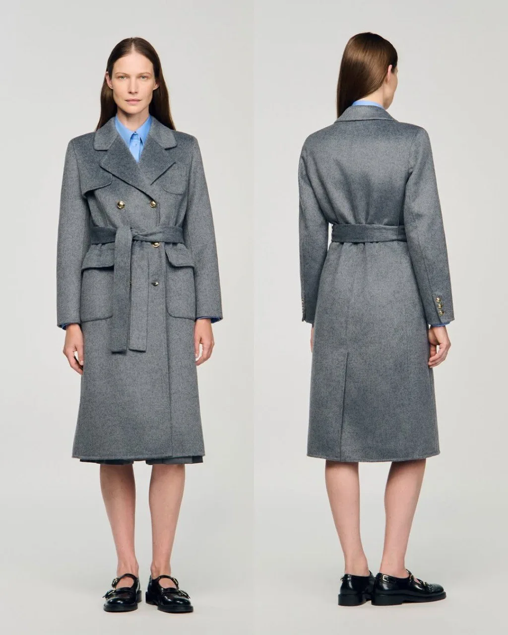 Двустороннее клетчатое пальто серого цвета от Sandro Paris;