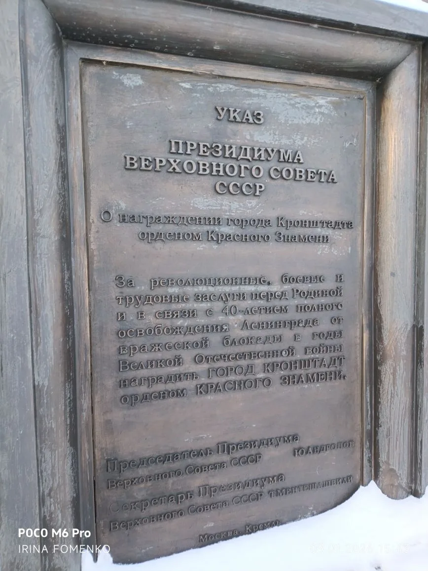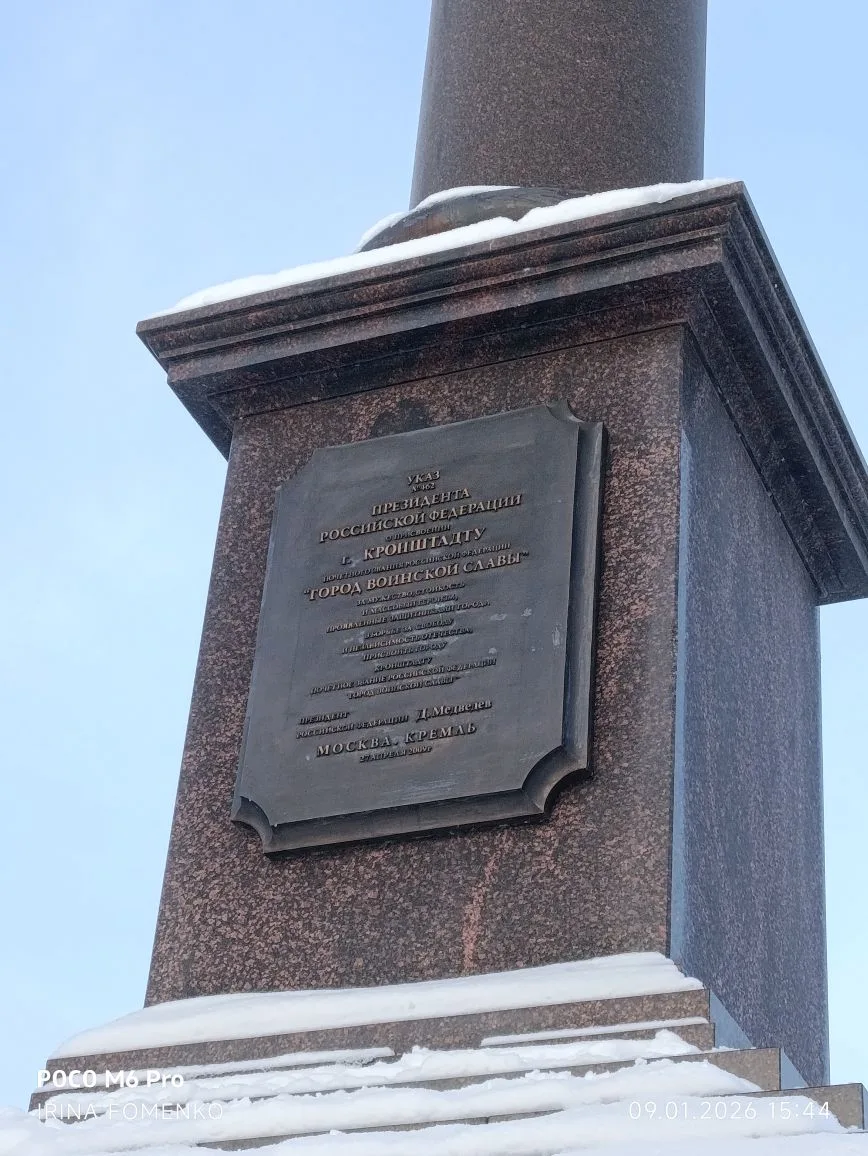 ✅ Памятник рассказывает о присвоении Кронштадту почётного звания «Город воинской славы» указом Президента РФ в апреле 2009 года.