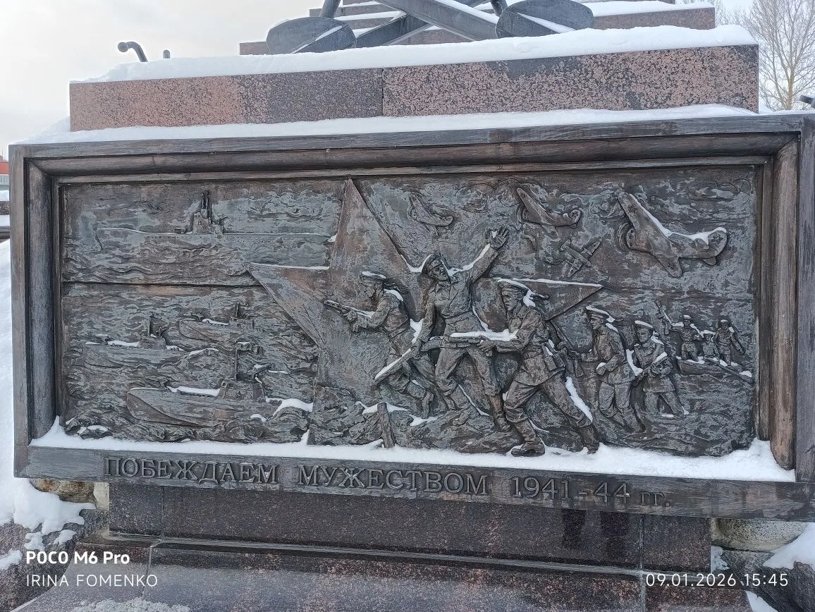 ✅ На южной стороне выполнен рельеф «Побеждаем мужеством 1941–44 гг.».