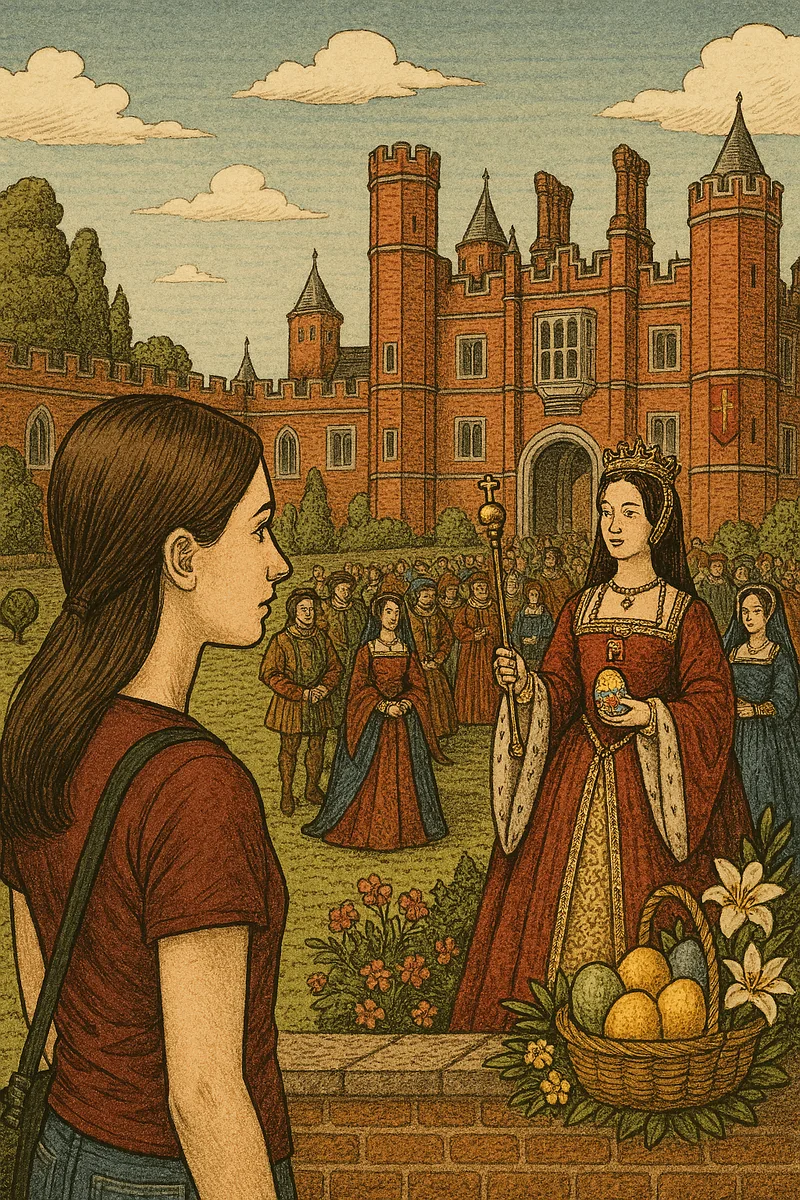 Я стою на пороге невероятного путешествия во времени, направляясь в Гринвичский дворец 12 апреля 1533 года, в день представления Анны Болейн как будущей королевы. Перед глазами возникает картина пасхи времен Тюдоров: золотые ткани, звон колоколов, аромат весенних цветов и ладана наполняют воздух.