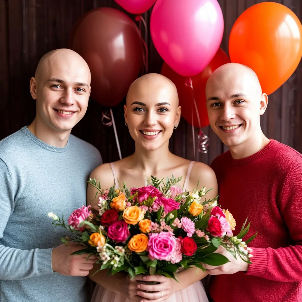 Каково же было удивление у мужа знакомой, когда еще через день, к нему пришли три его друга абсолютно лысыми. В руках они держали цветы и воздушные шарики. На них было написано: