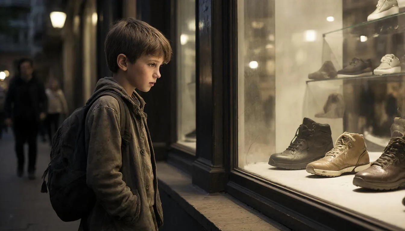 Мальчик лет девяти-десяти в ветхой одежде и рваных ботинках стоял у витрины обувного магазина и дрожал от холода. Он рассматривал на витрине теплую обувь и мечтал о новых ботинках.