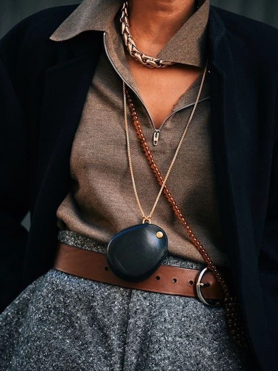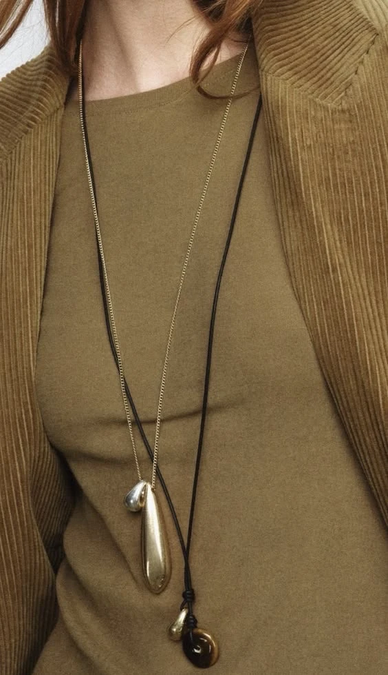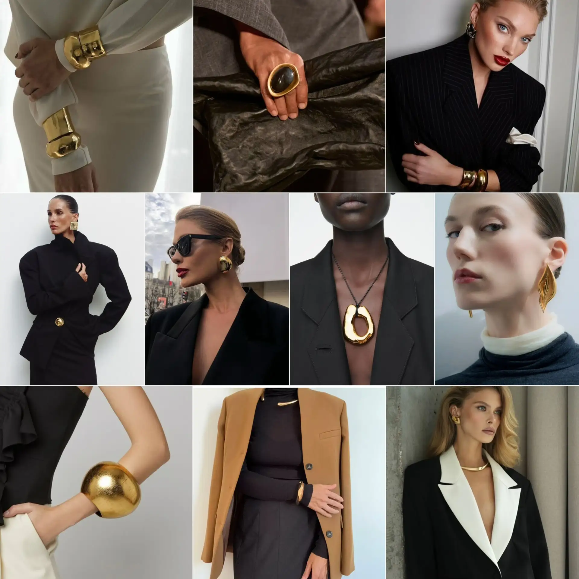 Выберите одно центральное украшение (например, массивное колье или яркие серьги). Все остальное (цепочка, кольца, браслет) должно быть в разы скромнее и просто поддерживать его, не перетягивая внимание.