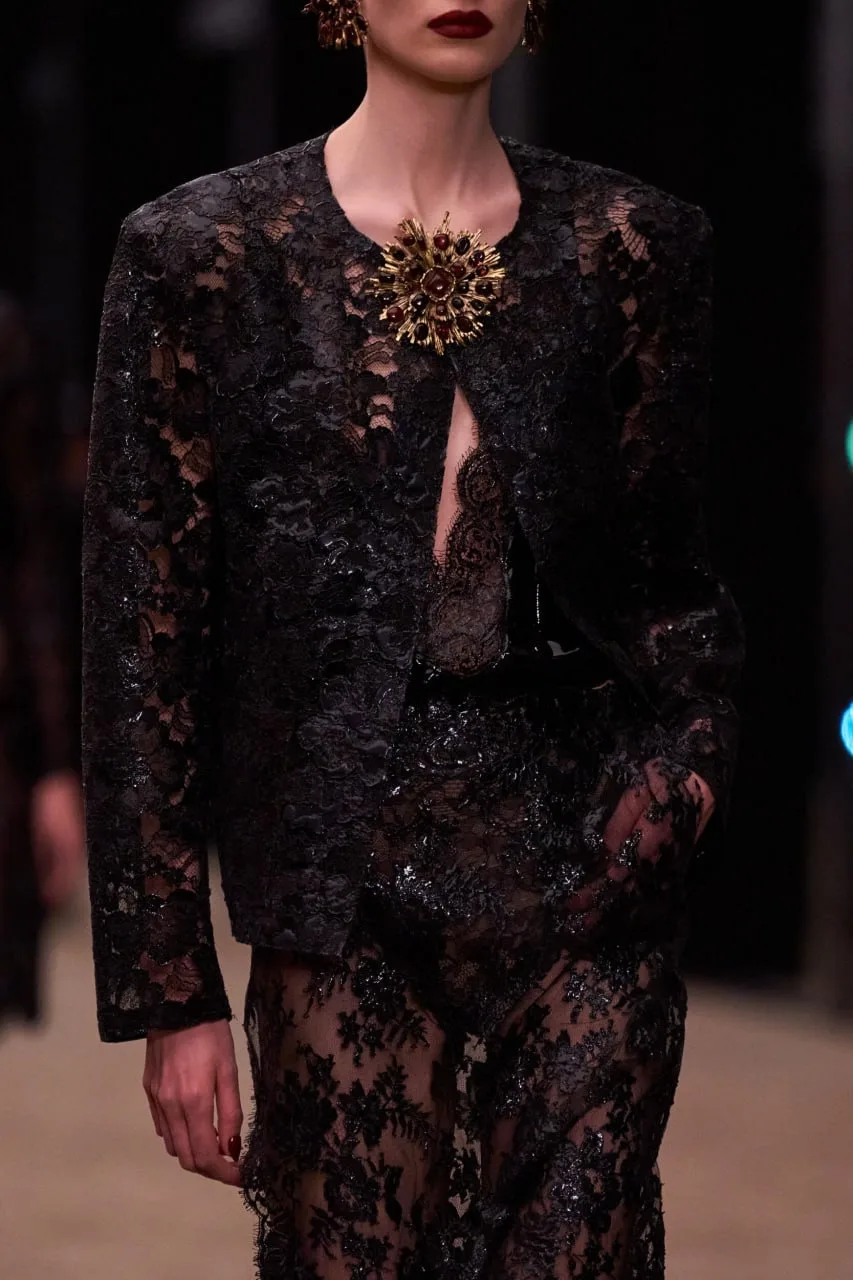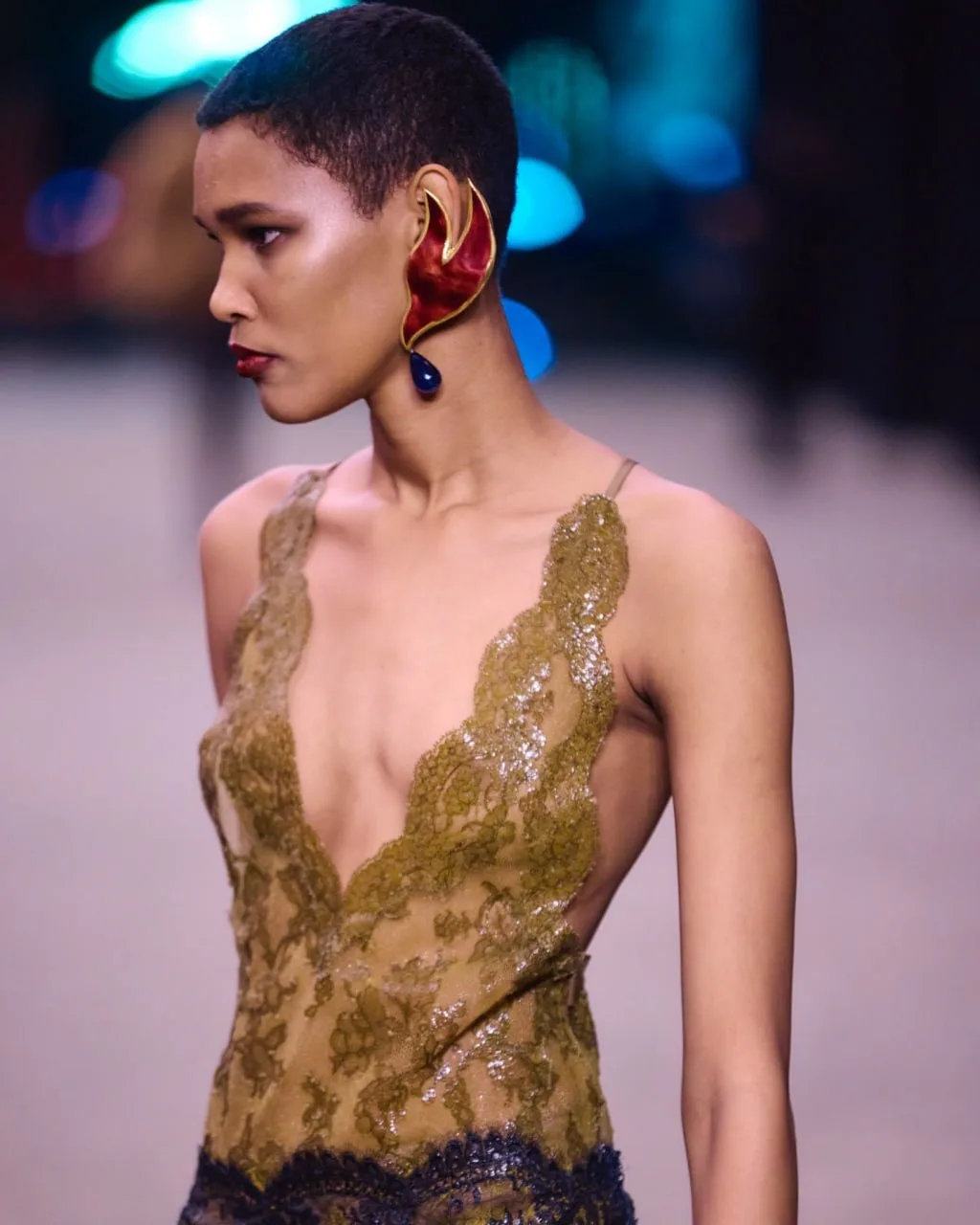 Если одежда коллекции — это гимн структуре (жакеты с гипертрофированными плечами, кружево, пальто из тяжелого меха), то главный эмоциональный удар нанесли украшения. И здесь Ваккарелло превзошел сам себя.
