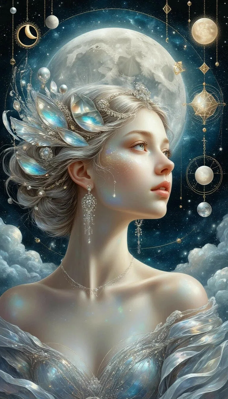 Аксессуары: серебряные детали, прозрачные украшения, кристаллы, мягкое сияние.