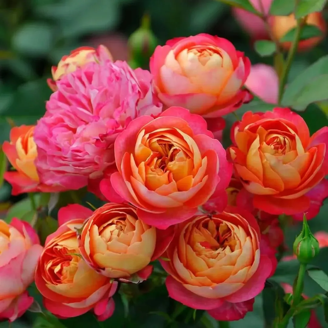 Глубоко чашевидные цветки, с золотистым реверсом лепестков, с возрастом выгорающие до оранжево-розовых. На побегах как одиночные, так и в небольших соцветиях. Цветение волнами в течение всего сезона. Сорт абсолютно устойчив к заболеваниям.