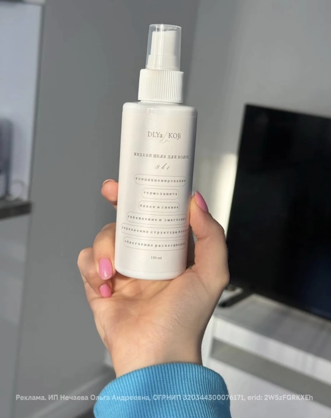 Сейчас использую спрей-термозащиту «Жидкий шелк» 8в1 от DLYa KOJi da. Он защищает волосы при сушке и укладке, делает длину более гладкой и мягкой и при этом не утяжеляет волосы.