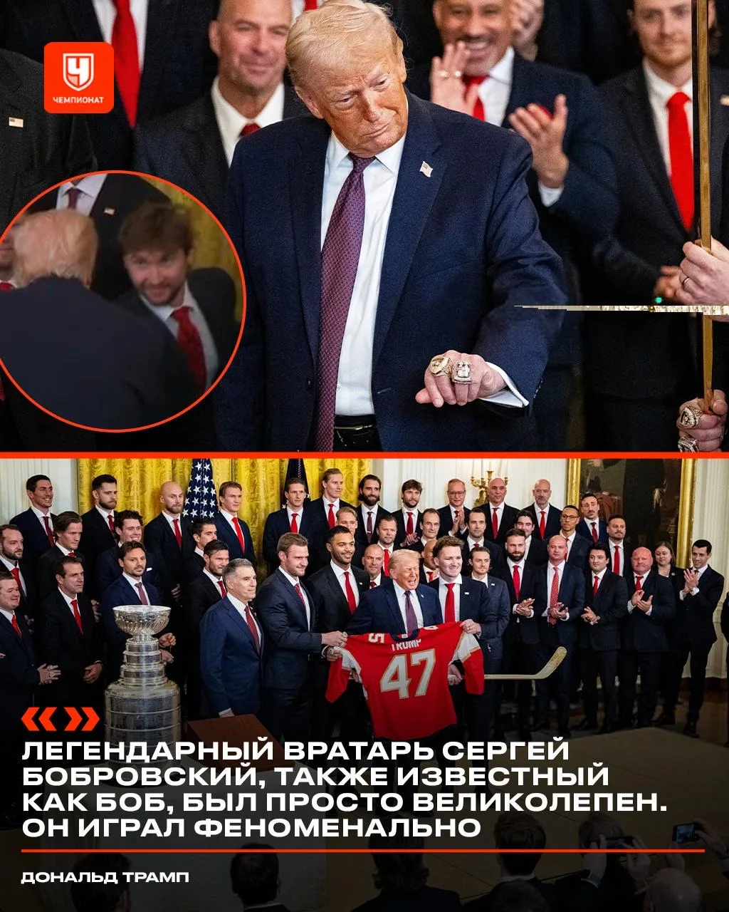 Трамп получил чемпионские перстни НХЛ и снова выделил Бобровского 🤝