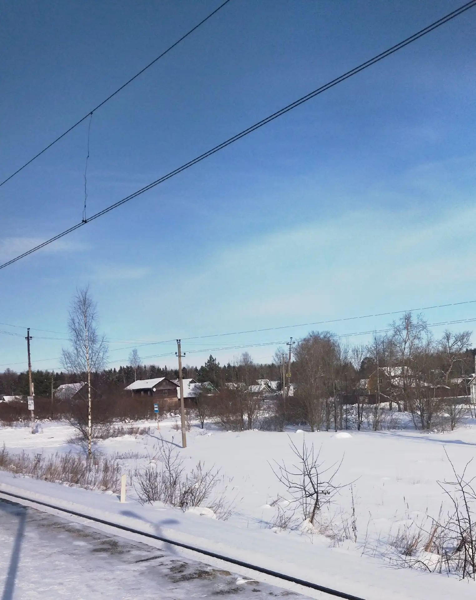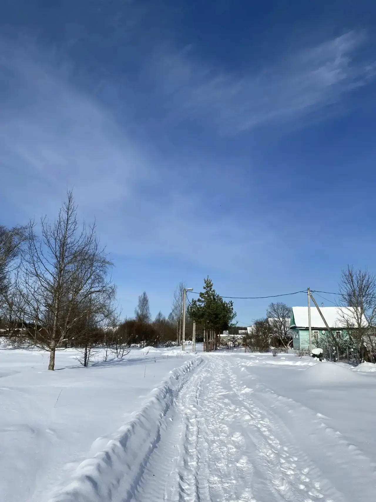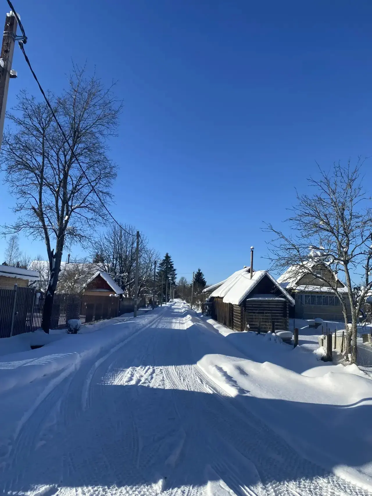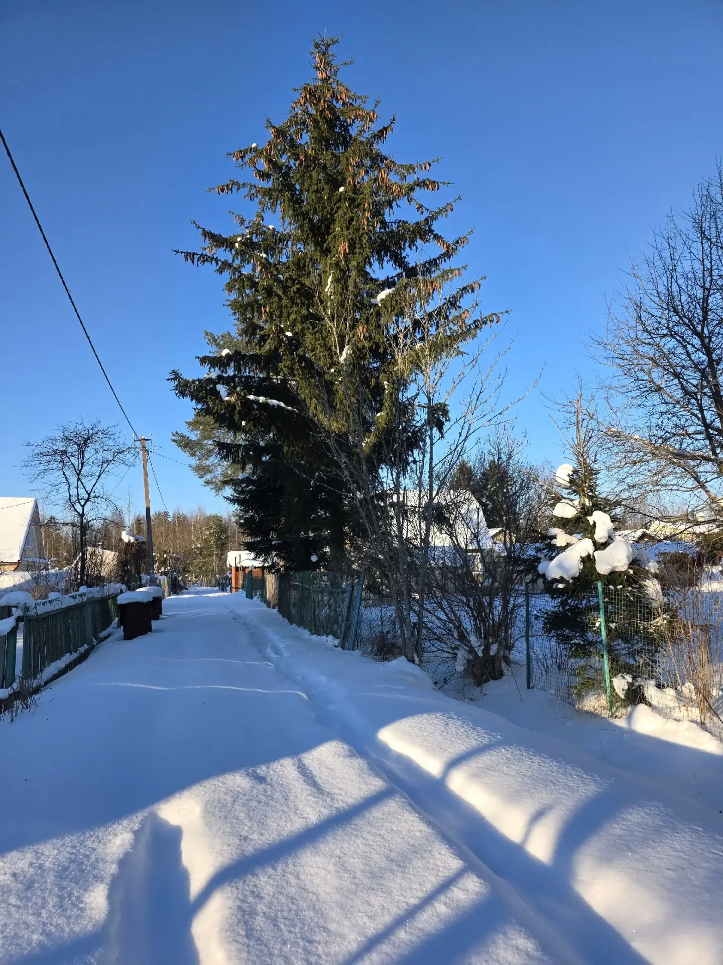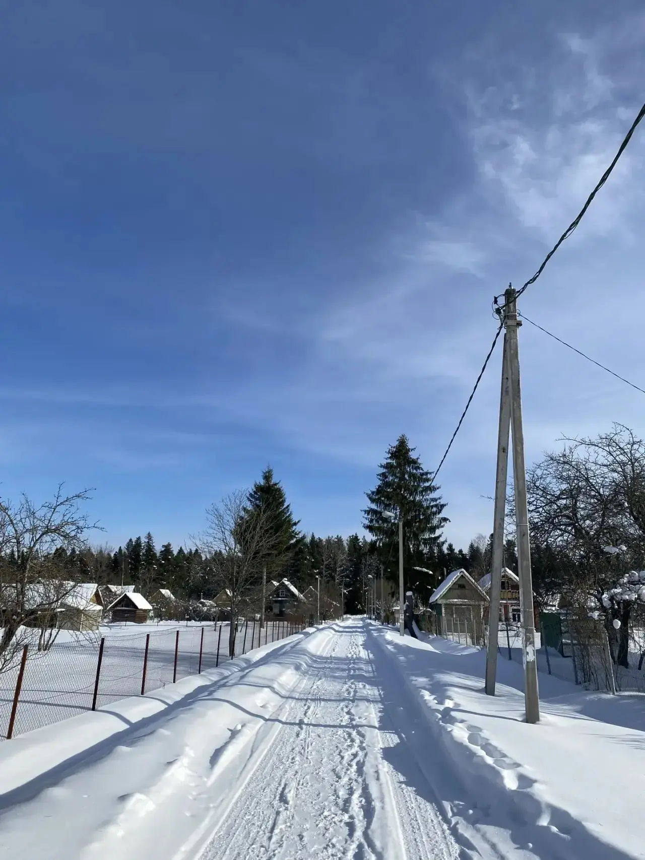 Погода шикарная! Иногда только налетает холодный ветерок. Дорога в поселке Чаща почищена и посыпана песочком.